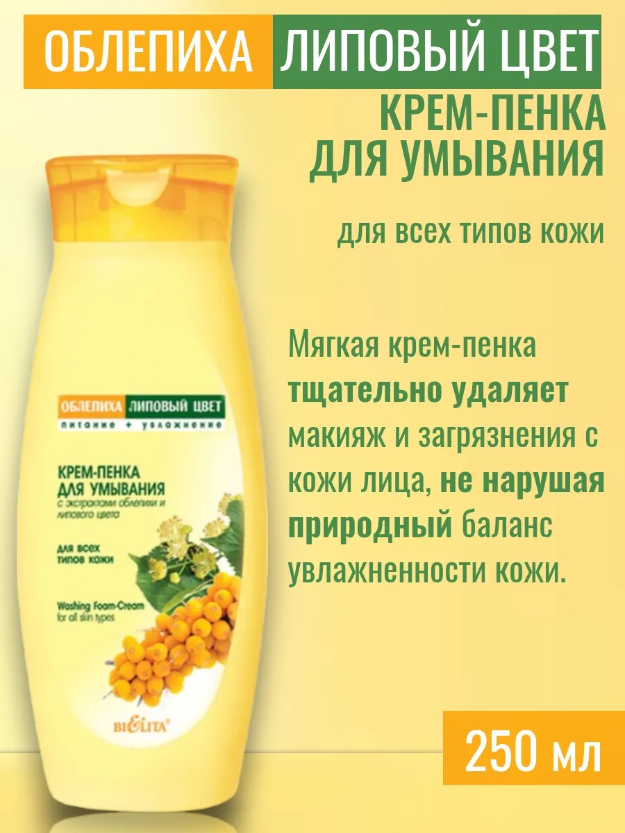 Белита Облепиха и липовый цвет Крем-пенка для умывания 250мл. Крем-пенка для умывания для всех типов кожи Облепиха и липовый цвет.Мягкая крем-пенка тщательно удаляет макияж и загрязнения с кожи лица, не нарушая природный баланс увлажненности кожи. Не содержит мыла.