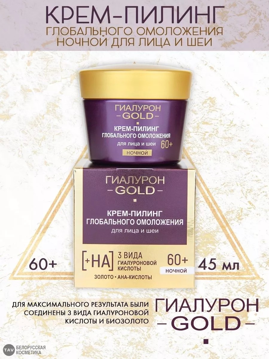 This exceptional night cream-peeling is created taking into account the characteristics and needs of skin aged over 60. Its modern composition combines the intensive action of a renewing peel with the comfort of a nourishing cream. The main active ingredients – hyaluronic acid of three molecular sizes; biogold; AHA acids; ultra-nourishing shea and macadamia oils – act on three levels of the epidermis (upper, middle, and deep), visibly improving the appearance and condition of very mature skin, providing a global anti-aging effect during a healing night's rest. Hyaluronic acid of three molecular sizes penetrates all layers of the epidermis, activating deep cellular metabolism and restoring the skin's youthful resources. High-molecular hyaluronic acid hydrates the skin in the upper layers; tightens; evens out its tone, giving a fresh, bright, radiant complexion. Medium molecular weight hyaluronic acid penetrates the middle layers of the skin, stimulates the production of its own hyaluronic acid, increases firmness, density and elasticity of the skin. Low molecular weight hyaluronic acid acts in the deepest layers of the epidermis, filling the skin with moisture and "pushing out" wrinkles from the inside, strengthening and tightening facial contours, providing a powerful and long-lasting lifting effect. Result: in the morning, the skin looks rested, fresh, smooth and rejuvenated, even deep wrinkles and creases are reduced, the contours of the face and neck become clearer and more toned. Maximum results are achieved with the comprehensive use of the line's products. The effect accumulates and lasts for a long time. Suitable for all skin types. Recommended for use from the age of 60. Purpose: Moisturizing; Nutrition; Restoration; Lifting; Rejuvenation; Anti-aging care. Application: Apply in the evening to cleansed skin of the face and neck.