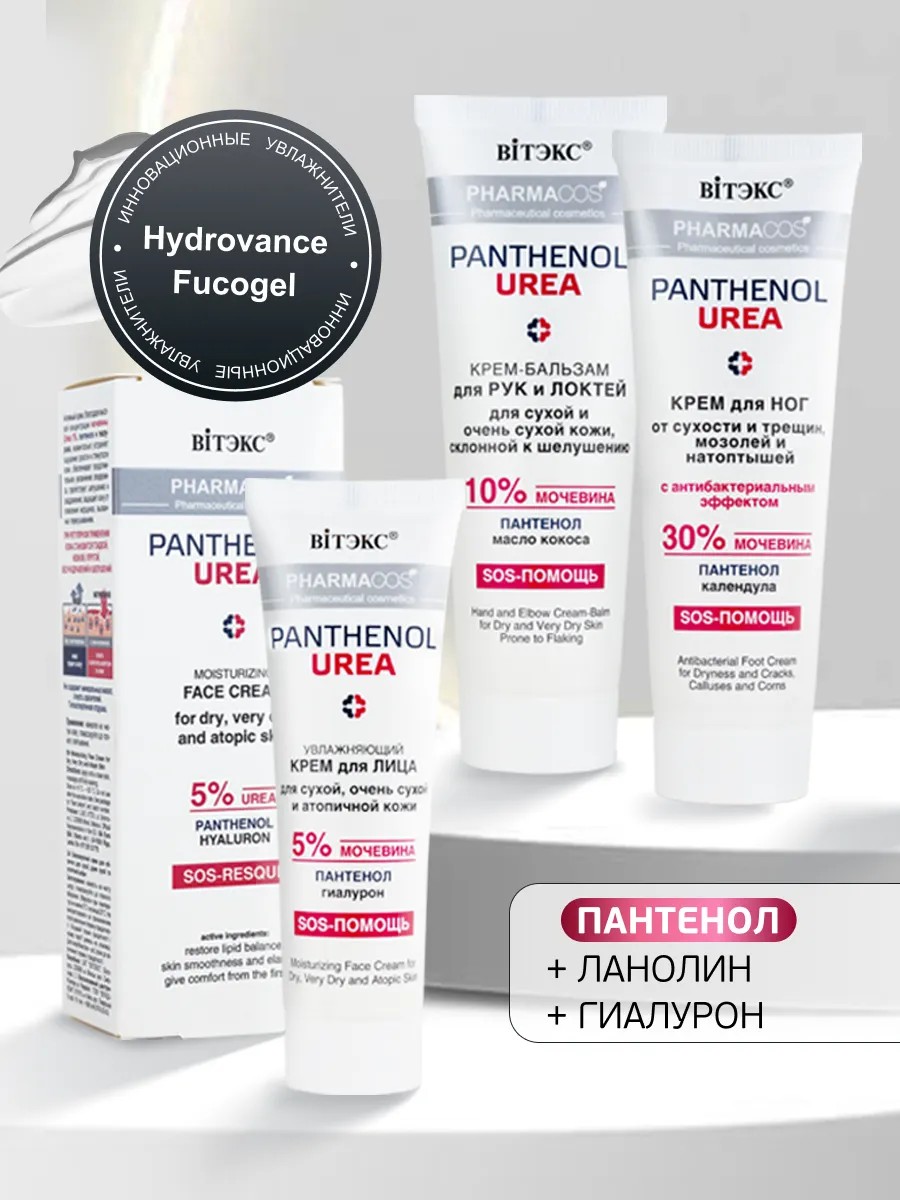 Набор аптечной линии Pharmacos PANTHENOL UREA . Крем для ног от сухости и трещин, мозолей и натоптышей с антибактериальным эффектом. Крем с высокой концентрацией компонентов особенно рекомендуется для интенсивного восстанавливающего ухода за кожей ног, склонной к сухости и ороговению. Активная формула содержит 30% мочевины (Urea), которая превосходно увлажняет и смягчает кожу, препятствует пересушиванию, предотвращает образование избыточного ороговения, защищает кожу от появления трещин, мозолей и натоптышей. Крем-бальзам для рук и локтей для сухой и очень сухой кожи, склонной к шелушению. Крем-бальзам с высокой концентрацией компонентов особенно рекомендуется для интенсивного питания, увлажнения, восстановления и защиты сухой и очень сухой кожи. Активная формула содержит 10% мочевины (Urea), которая очень быстро и эффективно увлажняет кожу даже в глубоких слоях, препятствует появлению шелушения, раздражения и микротрещинок, вызванных пересушенностью кожи.Увлажняющий крем для лица для сухой, очень сухой и атопичной кожи. Нежный, нежирный крем с высокой концентрацией компонентов особенно рекомендуется для интенсивного увлажнения, восстановления и защиты сухой, очень сухой и атопичной кожи. Активная формула содержит 5% мочевины (Urea), которая очень быстро и эффективно увлажняет кожу даже в глубоких слоях, длительное время поддерживает здоровый уровень гидратации эпидермиса, препятствует появлению шелушения, раздражения и морщинок, вызванных обезвоживанием кожи.Пантенол (Panthenol) моментально дарит коже комфорт, устраняет ощущение сухости и стянутости, успокаивает и разглаживает.Гиалурон обеспечивает мгновенное и продолжительное увлажнение эпидермиса, усиленное эффектом «захвата и удержания влаги», защищает кожу от пересушивания. Не содержит минеральных масел, спирта, красителей. Гипоаллергенная отдушка. Это хороший подарок любимой маме, сестре, подруге, бабушке, коллегам и друзьям на 8 марта и День Рождения.