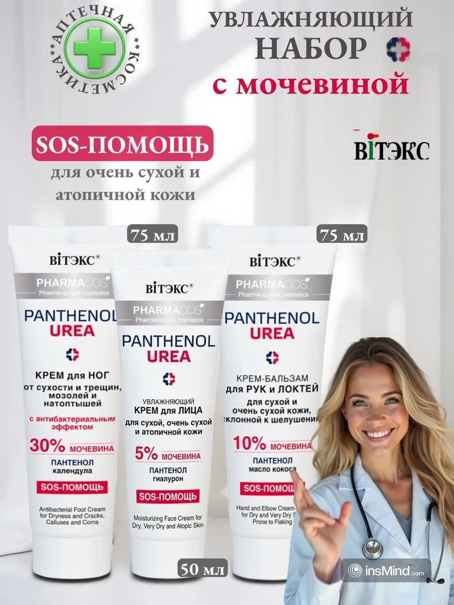 Набор аптечной линии pharmacos panthenol urea . Крем для ног от сухости и трещин, мозолей и натоптышей с антибактериальным эффектом. Крем с высокой концентрацией компонентов особенно рекомендуется для интенсивного восстанавливающего ухода за кожей ног, склонной к сухости и ороговению. Активная формула содержит 30% мочевины (urea), которая превосходно увлажняет и смягчает кожу, препятствует пересушиванию, предотвращает образование избыточного ороговения, защищает кожу от появления трещин, мозолей и натоптышей.