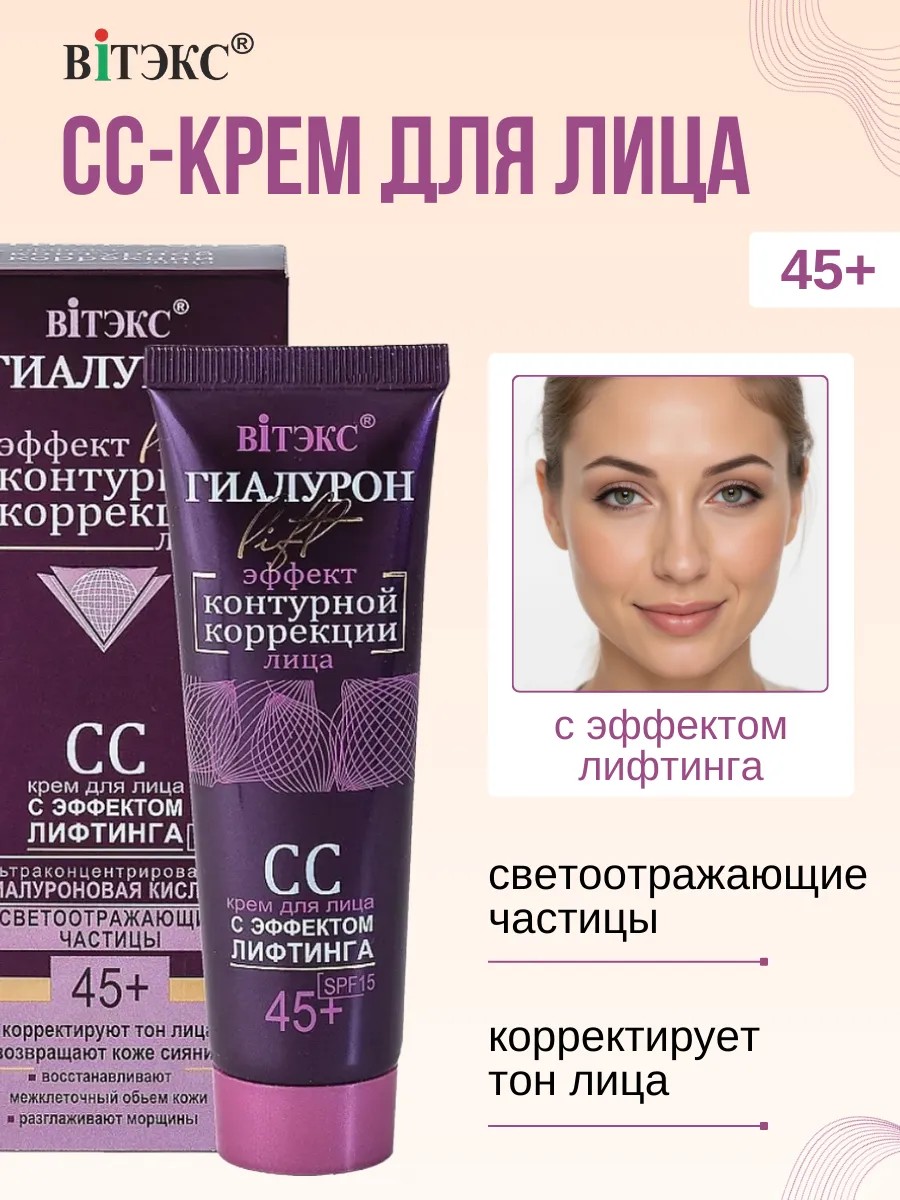 Ultra-concentrated hyaluronic acid. Light-reflecting particles correct skin tone, restore radiance, restore intercellular volume, and smooth wrinkles. CC face cream with a lifting effect is a multifunctional product that instantly corrects complexion and tightens the skin, smoothing fine lines and wrinkles.