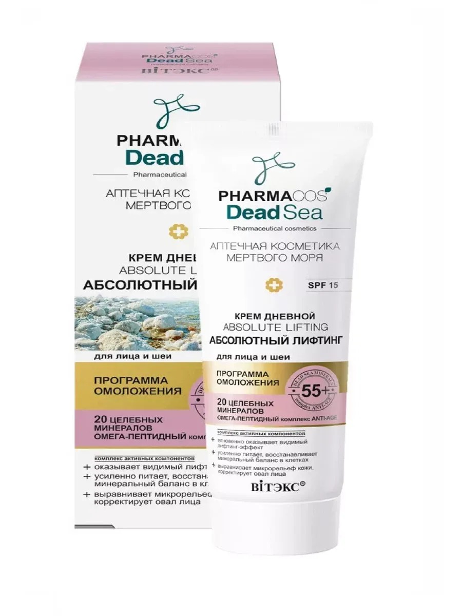 Витэкс, Крем PHARMACos DEAD SEA дневной 55+ Absolute Lifting Абсолютный лифтинг для лица, шеи SPF 15 50 мл, 1 шт. 20 целебных минералов Омега-пептидный комплекс ANTI-AGE оказывает видимый лифтинг-эффект, усиленно питает, восстанавливает минеральный баланс в клетках, выравнивает микрорельеф кожи, корректирует овал лица. Программа омоложения интенсивная формула крема с богатым комплексом ингредиентов, специально подобранных под физиологические потребности зрелой кожи, обеспечивает абсолютный лифтинг, минимизирует признаки внутреннего и внешнего старения кожи, значительно улучшает качество и внешний вид кожи. Целебный эликсир из 20 минералов Мертвого моря активно насыщает клетки необходимыми веществами, стимулирует процессы самовосстановления, помогает поддерживать здоровый уровень увлажненности, борется с увяданием кожи. Омега-пептидный комплекс ANTI-AGE оказывает заметное омолаживающее действие на кожу: подтягивает и разглаживает, уменьшает выраженность всех видов морщин, осветляет пигментные пятна, выравнивает цвет лица, повышает плотность, упругость и эластичность кожи. Уникальный комплекс 3D экспресс-лифтинг мгновенно преображает кожу: образует на поверхности кожи структурную сеточку, которая, как невидимый корсет, красиво очерчивает и поддерживает четкий контур лица, разглаживает морщинки, придает чертам лица выразительность. Технология размытого фокуса эффективно маскирует возрастные несовершенства кожи, делая ее нежной и ровной, придавая естественное здоровое сияние. Эффективные УФ-фильтры защищают кожу от негативного влияния излучений, предохраняя от фотостарения.