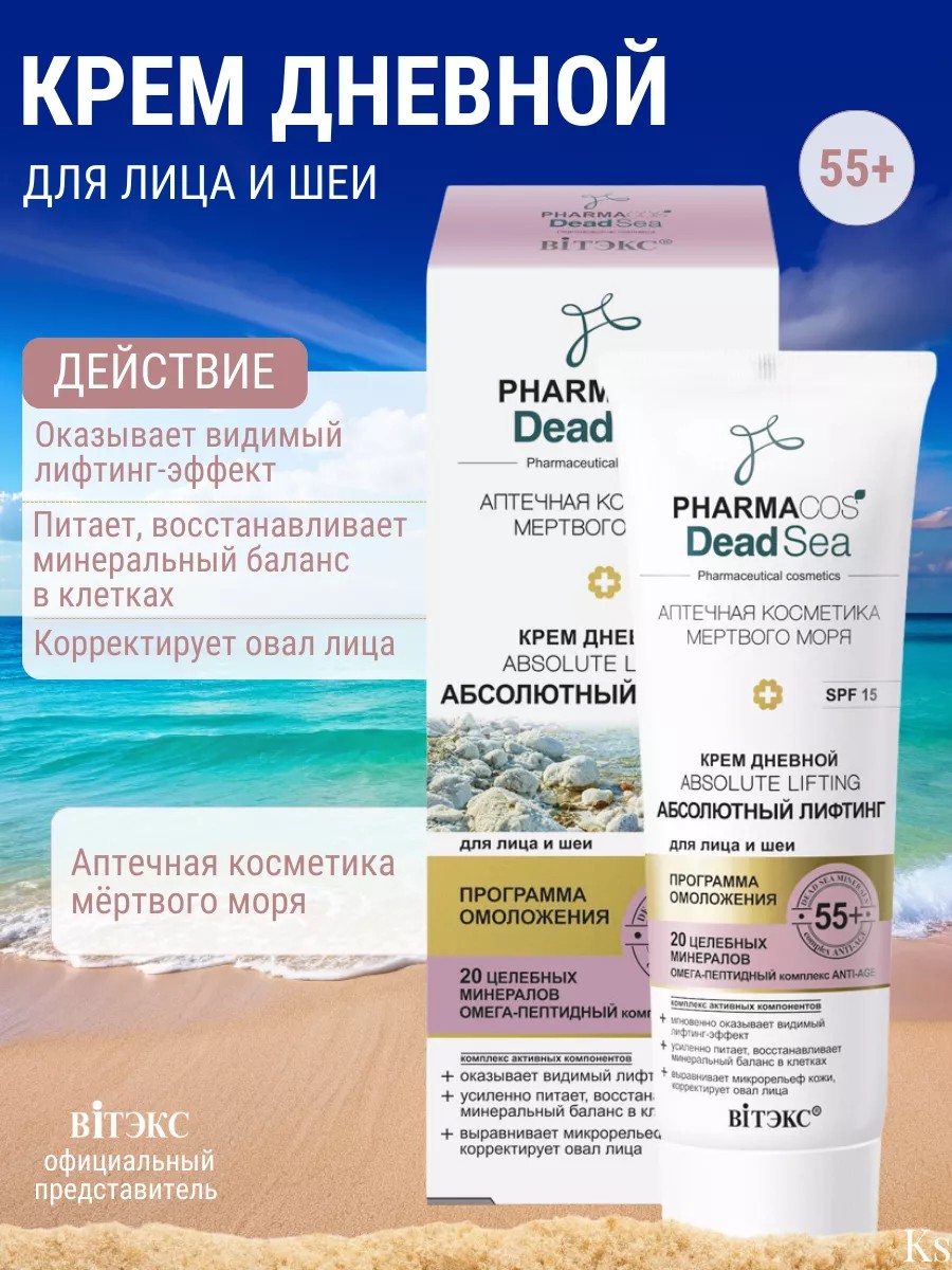 Absolute Lifting Day Cream 55+ for Face and Neck with 20 Healing Minerals. This intensive formula with a rich complex, tailored to the needs of mature skin, provides complete lifting and minimizes signs of aging. An elixir of 20 Dead Sea minerals nourishes cells with essential nutrients, stimulates self-healing processes, maintains healthy hydration levels, and combats aging. The ANTI-AGE Omega Peptide Complex has a rejuvenating effect: it tightens, reduces the appearance of wrinkles, lightens pigmentation spots, evens out skin tone, and improves firmness and elasticity. The unique 3D Express Lifting Complex creates a structural mesh on the skin's surface, like an invisible corset, maintaining a defined facial contour and smoothing wrinkles. Blurred Focus technology conceals age-related imperfections, imparting a natural, healthy glow. UV filters protect against the negative effects of radiation, preventing photoaging. Hyaluronic acid restores moisture balance and fills wrinkles. Chicory root polysaccharides form an invisible mesh, instantly lifting and smoothing, erasing signs of aging. The duopeptide complex contains liposomes, ensuring deep penetration of active ingredients into cells. Collagen and elastin synthesis is activated, smoothing wrinkles. Omega 3-6-9 fatty acids work in several ways: rejuvenation, hydration, renewal, reduction of irritation and flaking, and improvement of appearance. Glycerin has the ability to attract moisture and is an effective humectant. It softens and prevents irritation and inflammation. Biosaccharide forms a weightless veil on the surface that protects from negative influences. Shea butter is highly bioactive, intensively saturating the skin with valuable components, softening, and evening out skin tone. Result: Moisturized, toned, and smoothed skin looks younger, fresher, and more radiant. The cream can be used as a makeup base.