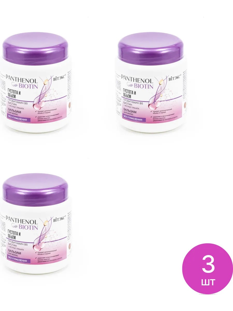 Витэкс Panthenol & Biotin Густота и объем Бальзам для волос с провитамин В5 и биотином 450мл / уходовая косметика. Комплект состоит из 3 шт. Цена за комплект. Питание и увлажнение необходимо не только нашему организму, но и волосам. Здоровые волосы - показатель здоровья нашего организма. Бальзам для волос Витэкс Panthenol & Biotin Густота и объем для тонких и ослабленных волос мгновенно увлажняет и восстанавливает структуру волос по всей длине. Волосы обретают жизненную силу, блеск и шелковистость. Средство для восстановления волос содержит провитамин В5, который увлажняет и восстанавливает волосы, придает им дополнительную густоту и плотность, облегчает укладку, дарит волосам глянцевый блеск и роскошный объем. Биотин улучшает состояние кожи головы, способствует увеличению количества, объема и толщины волос, уменьшает выпадение. Позаботьтесь о здоровье своих волос с бальзамом от Витэкс Panthenol & Biotin Густота и объем! Уход за волосами / бальзам для волос женский / уходовая косметика Состав: вода, цетеариловый спирт, хлорид цетримония, кватерниум-87, пантенол, экстракт Punica Granatum (граната), биотин, парфюмерная композиция, силикон кватерниум-18, тридецет-6, тридецет-12, ЭДТА динатрия, бензиловый спирт, метилхлоризотиазолинон, метилизотиазолинон, метилпарабен, лимонная кислота, пропилпарабен, линалол, гексилциннамаль.