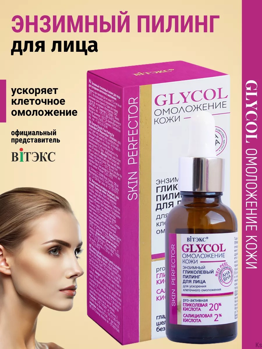 Энзимный гликолевый пилинг для лица от белорусского бренда Витекс - это эффективное средство, который активно отшелушивает ороговевшие клетки кожи, разглаживает микрорельеф, сокращает глубину морщин, осветляет пигментацию и веснушки, выравнивает текстуру и тон кожи, сужает расширенные поры, восстанавливает естественное сияние. Пилинг для лица - настоящий спаситель для кожи лица. Уходовая косметика для лица «GLYCOL Омоложение кожи» эффективно удаляет ороговевшие клетки, позволяя коже дышать и впитывать питательные вещества гораздо лучше. Результаты применения уже заметны после нескольких процедур - кожа становится более упругой, гладкой и светлой. Уже после первой процедуры ускоряется клеточное омоложение, увеличивается выработка коллагена, восстанавливается упругость и эластичность кожи, уменьшается выраженность морщин, в том числе глубоких заломов и носогубных складок, кожа выглядит более молодой, сияющей и свежей без признаков старения. Благодаря уникальной формуле гликолевого пилинга, ваша кожа будет выглядеть моложе и здоровее. Глубокое очищение пор поможет избавиться от черных точек, а регулярное использование средства способствует выравниванию тону кожи и улучшению ее текстуры. Воспользуйтесь возможностью ускорить клеточное омоложение и наслаждаться результатами уже через короткое время. Эффективная альтернатива профессиональным салонным пилингам и инъекционным методам омоложения. Применение: нанесите пилинг тонким слоем на сухую очищенную кожу, избегая области вокруг глаз. Через 7-10 минут смойте водой. Не наносите на поврежденную, раздраженную или воспалeнную кожу. Процедуру рекомендуется проводить вечером 1 раз в 7-10 дней. Обязательно используйте крем с УФ-защитой не менее 7 дней после применения.