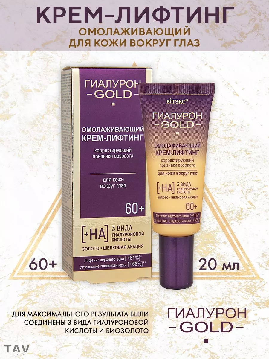 This rejuvenating lifting cream, correcting the signs of aging for the skin around the eyes, is designed to meet the specific needs of skin aged 60 and over. Its intelligent formula, containing 3 types of hyaluronic acid, biogold, silk acacia, and sophisticated, highly scientific rejuvenating and brightening complexes, has a targeted effect on all signs of aging: it reduces expression lines and deep wrinkles around the eyes; relieves puffiness; tightens the skin of the upper and lower eyelids; lightens dark circles; and refreshes the look. Immediately after applying the cream, a lifting effect occurs instantly and lasts throughout the day. Special lifting components form an invisible supporting micro-mesh on the skin, acting as an anti-wrinkle corset. Result: with regular use, the skin around the eyes is transformed, wrinkles become significantly smaller, dark circles and puffiness gradually disappear, and the skin tone evens out, leaving it clean, fresh, and soft. Maximum results are achieved with the combined use of the products in this line. The effect is cumulative and long-lasting. Recommended for use from age 60. Proven by Givaudan (Switzerland). Proven by Sederma (France). Purpose: Moisturizing; Brightening; De-puffing; Lifting; Rejuvenation. Directions: Apply morning and/or evening to cleansed eyelids.