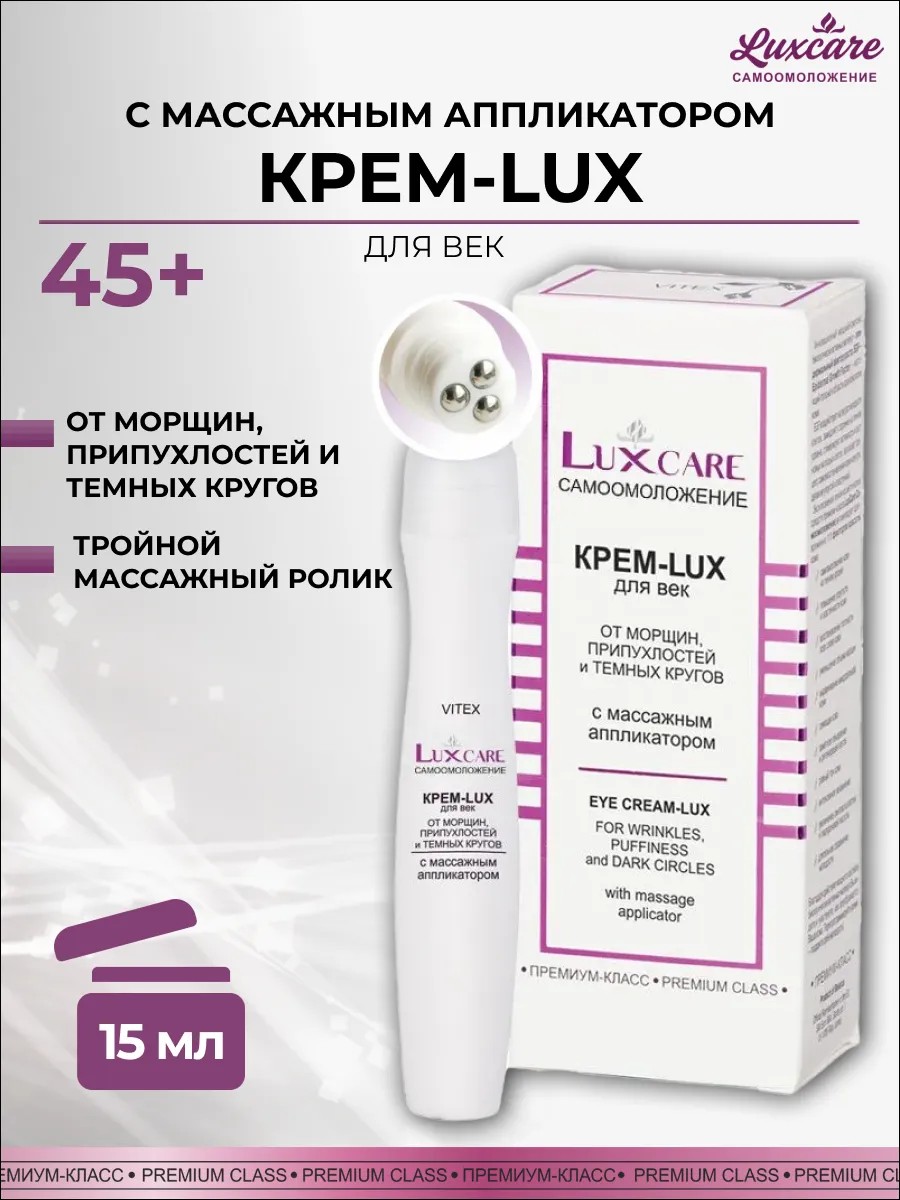 Витэкс LUXCARE Крем-Lux для век от морщин, припухлостей и темных кругов с массажным аппликатором. Мультиактивная формула с повышенным содержанием новейших антивозрастных ингредиентов активизирует 11 факторов красоты и повышает потенциал самообновления кожи на всех уровнях, оказывает мгновенный лифтинг-эффект, разглаживает мимические морщинки, препятствует их появлению. Благодаря уникальной технологии дермальной доставки компонентов в глубокие слои кожи, признаки возраста стираются, кожа расправляется и выглядит заметно более молодой и свежей. Тройной массажный ролик улучшает микроциркуляцию в коже, усиливая эффективность активных компонентов, оказывает приятное охлаждающее и тонизирующее действие. Ваша кожа преображается каждый день она приобретает совершенное сияние и свежесть молодости.