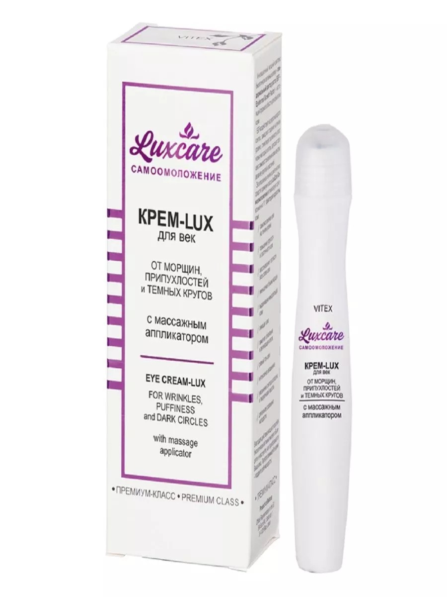 Lux Eye Cream for Wrinkles, Puffiness, and Dark Circles with a Massage Applicator, 15 ml. The multi-active formula with an increased content of the latest anti-aging ingredients activates 11 beauty factors and enhances the skin's self-renewal potential at all levels, provides an instant lifting effect, smoothes expression wrinkles, and prevents their appearance.