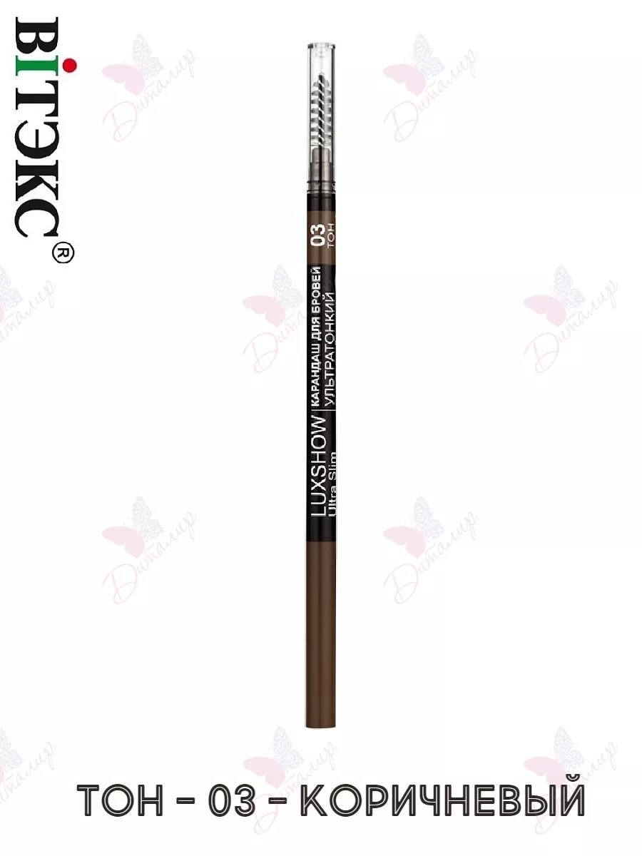 VITEX Карандаш для бровей Ультратонкий пудровый LUXSHOW, тон 03 Коричневый. Ультратонкий карандаш идеален для макияжа бровей: с ним можно легко и быстро нарисовать линии любой толщины, придать бровям желаемую форму и изгиб, сделать их визуально более густыми и пушистыми или подчеркнуть природную красоту. Стойкая высокопигментированная формула с роскошным пудровым финишем позволяет сохранить четкость линий и насыщенность цвета до 12 часов! Палитра оттенков, максимально близких к натуральным, подходит для любого цветотипа и любого оттенка волос. Касторовое масло, пчелиный воск и витамин Е ухаживают за волосками, укрепляют их, придают блеск и гладкость. С помощью удобной щёточки-расчёски можно аккуратно расчесать и уложить волоски, а также легко растушевать пигмент и добиться желаемой интенсивности или нежности оттенка. Гладкая кремовая текстура равномерно наносится, не расплывается и не размазывается. Карандаш не требует затачивания. Ультратонкий грифель плавно выкручивается, позволяя регулировать длину наконечника, благодаря чему удобно рисовать как широкие линии, так и тончайшие штрихи в технике микроблейдинга.