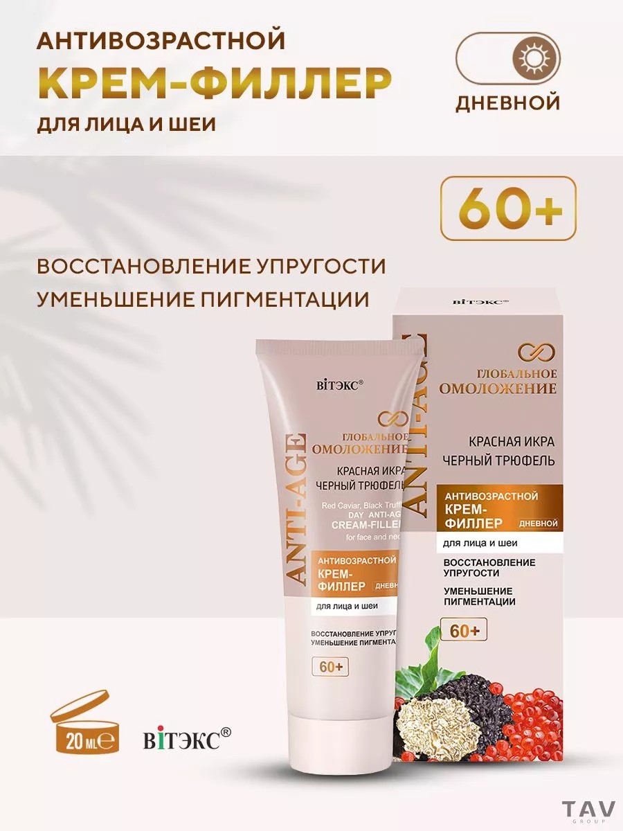 ANTI-AGING FILLER CREAM for face and neck, 60+, daytime use. FIRMNESS RESTORATION. PIGMENTATION REDUCTION. This filler cream is specially designed for daytime rejuvenating skin care for those over 60. A rich blend of powerful anti-aging ingredients, including red caviar and black truffle, provides mature skin of the face and neck with comprehensive restorative care, slows down the cellular aging process, and restores a more youthful and attractive appearance. Skin elasticity is significantly improved, facial contours are lifted and corrected, pigmentation is reduced, and the complexion becomes even and fresh. Thanks to special innovative ingredients, the cream has filler properties, filling wrinkles and nasolabial folds, "pushing" them out from within. Positive results are noticeable after just a few days of use: skin elasticity is significantly improved, the number and depth of wrinkles are significantly reduced, the facial contour is tightened and corrected, pigmentation is reduced, and the complexion becomes even and fresh. Directions: Apply in the morning to cleansed skin of the face and neck. Purpose: Rejuvenation, Elasticity.