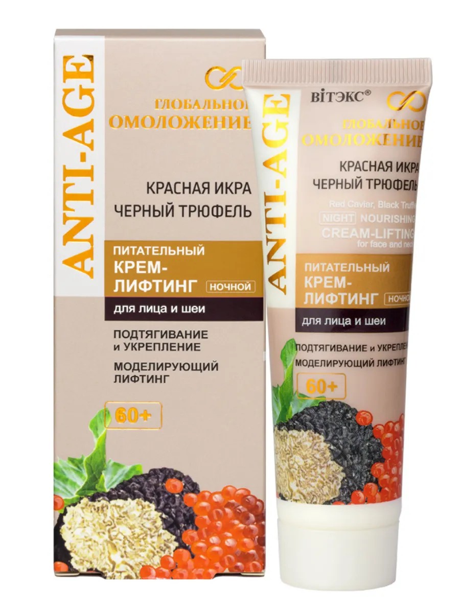 Питательный крем-лифтинг для лица и шеи 60+ ночной «ANTI-AGE Глобальное Омоложение» от белорусского бренда Витекс — это идеальный выбор для зрелой кожи, нуждающейся в интенсивном увлажнении и питании. Уходовая косметика для лица сочетает в себе мощные компоненты анти-старения (красная икра, черный трюфель, ценнейшие высокопитательные масла, инновационный комплекс Essenskin) глубоко насыщают кожу веществами, которые помогают устранить повреждения в ее структуре, полученные в течение дня. Напитанная, увлажненная, укрепленная, к утру кожа разглаживается и подтягивается (эффект лифтинга), уменьшается видимость морщин, восстанавливаются утраченные объемы лица, возвращается свежий, ровный, яркий цвет лица. Крем для лица увлажняющий и питательный, насыщает кожу влагой, предотвращая её обезвоживание и обеспечивая комфорт на протяжении всей ночи. Антивозрастной уход за лицом активно борется с морщинами, восстанавливая упругость и эластичность кожи. Благодаря уникальному составу, крем для лица от морщин помогает подтянуть контуры лица, придавая коже более молодой и свежий вид. Питательный крем для лица специально разработан для женщин старше 60 лет, обеспечивая комплексный уход за кожей, которая нуждается в дополнительном внимании и заботе. Ночной крем для лица антивозрастной активизирует процессы восстановления кожи во время сна, что позволяет проснуться с заметно более гладкой и сияющей кожей. Крем легко наносится и быстро впитывается, не оставляя жирной пленки, что делает его идеальным для использования перед сном. Результаты поразительны: уже через несколько применений заметно явное уменьшение морщин, повышение тонуса и упругости кожи, восстановление объемов и четких очертаний лица. Выбирая крем от морщин для лица «ANTI-AGE Глобальное Омоложение», вы обеспечиваете своей коже необходимый уход, который способствует увлажнению, питанию и омоложению. Наслаждайтесь ощущением свежести и комфорта каждую ночь с питательным кремом-лифтингом от Vitex!