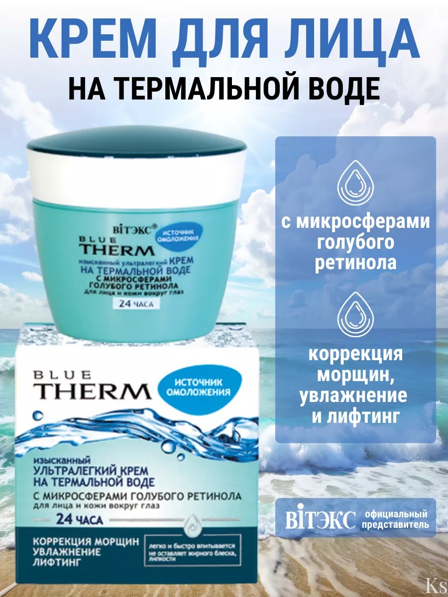 Изысканный ультралегкий крем на термальной воде с микросферами голубого ретинола для лица и кожи вокруг глаз 24 часа BLUE THERM от белорусского бренда косметики Витэкс.