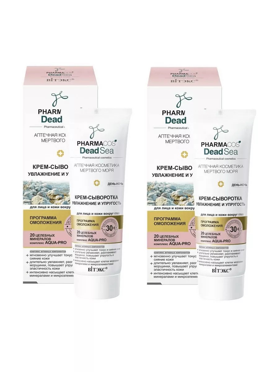 Комплект 2 штуки. Вiтэкс Крем-Сыворотка для лица и кожи вокруг глаз 30+ Pharmacos Dead Sea Увлажнение и упругость, 50 мл. Мультифункциональная композиция активных компонентов крема-сыворотки позволяет подстроиться под индивидуальные потребности кожи и обеспечить ей комплексный уход 24 часа: глубокое увлажнение и питание, оздоровление, восстановление естественного биоравновесия в коже, повышение плотности, упругости и эластичности кожи, профилактика появления возрастных изменений.