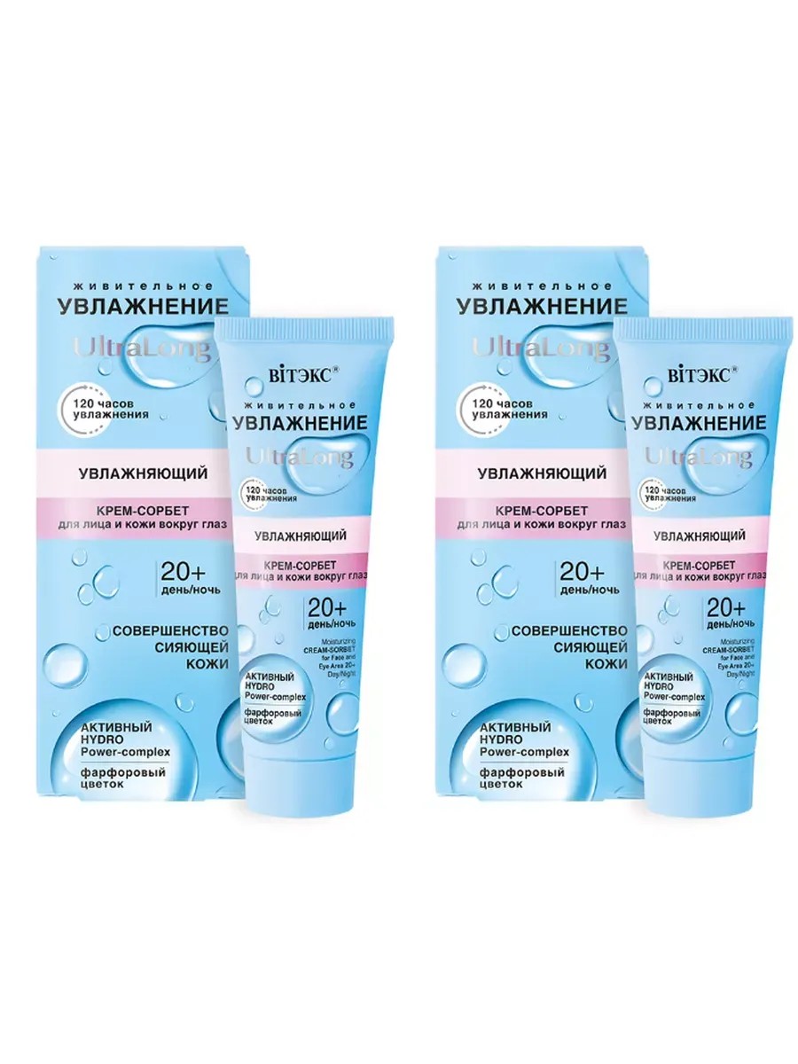 Живительное увлажнение 20+ Крем-сорбет увлажняющий для лица и кожи вокруг глаз дневной и ночной 40 мл. Крем-сорбет с легкой муссовой консистенцией – это новое поколение увлажняющих текстур, созданных экспертами ВИТЭКС в сотрудничестве с французскими учеными. Благодаря большому проценту активных компонентов в составе достигается быстрый и заметный результат: кожа напитывается влагой буквально на глазах, тон лица становится однородным, сияющим и красивым. Инновационный HYDRO Power-complex гарантирует непрерывное ультраувлажнение кожи до 120 часов: активные компоненты усваиваются максимально полно, в результате чего в клетках накапливаются питательные и увлажняющие вещества, надолго устраняется дефицит влаги на разных уровнях эпидермиса, улучшаются естественные защитные функции кожи. Фарфоровый цветок и комбучка совершенствуют цвет лица, тонизируют кожу, придают чистое нежное сияние.