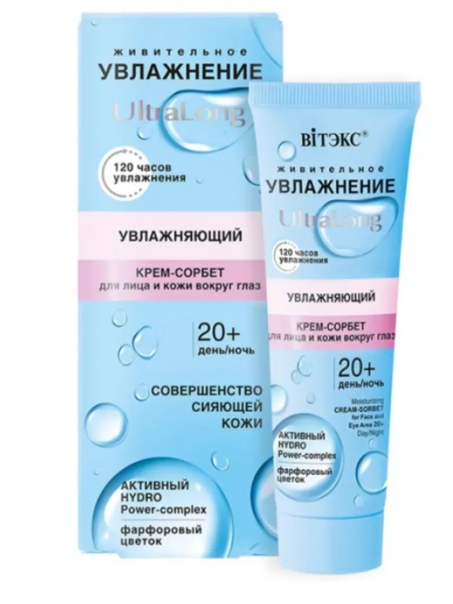 Face and Eye Cream-Sorbette, 40 ml. This cream-sorbet with a light mousse consistency is a new generation of moisturizing textures, created by Vitex experts in collaboration with French scientists. Thanks to the high percentage of active ingredients in the formula, quick and noticeable results are achieved: skin is hydrated literally before your eyes, and the complexion becomes even, radiant, and beautiful.