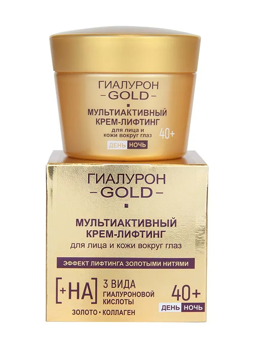 Vitex, Multi-Active Lifting Cream for Face and Eye Area 40+, Day/Night Hyaluron Gold, 45 ml. This multi-active lifting cream is designed specifically for the specific needs of skin over 40. Its cutting-edge, rich formula provides comprehensive 24-hour skin care: deep hydration, nourishment, and restoration, slowing down age-related changes in different layers of the epidermis, as well as a powerful and long-lasting lifting effect comparable to that of gold thread lifting. Hyaluronic acid of three molecular sizes actively acts both on the surface and deep within the skin, providing unrivaled rejuvenating results: expression lines are instantly filled, nasolabial folds, deep wrinkles, and fine lines are reduced, and the skin is intensely hydrated and elastic. Biogold allows active moisturizing, restorative, and anti-aging ingredients to penetrate the skin faster and deeper, significantly increasing their effectiveness. It slows the aging process and leaves skin radiant and glowing. Collagen replenishes the skin's own collagen, a key structural element of the epidermis. It prevents loss of tone and elasticity, strengthens and provides anti-aging protection for cells, and protects against wrinkles and other signs of aging. Sweet almond and apricot kernel oils provide cells with a complete nutritional diet, improve skin firmness and elasticity, impart velvety softness and tenderness, and help significantly improve complexion. With regular use, the number, length, depth, and width of wrinkles are reduced, skin becomes hydrated, nourished, well-groomed, and toned, glowing with freshness and beauty. The effect is cumulative and long-lasting. Directions: Apply morning and/or evening to cleansed skin of the face and around the eyes.