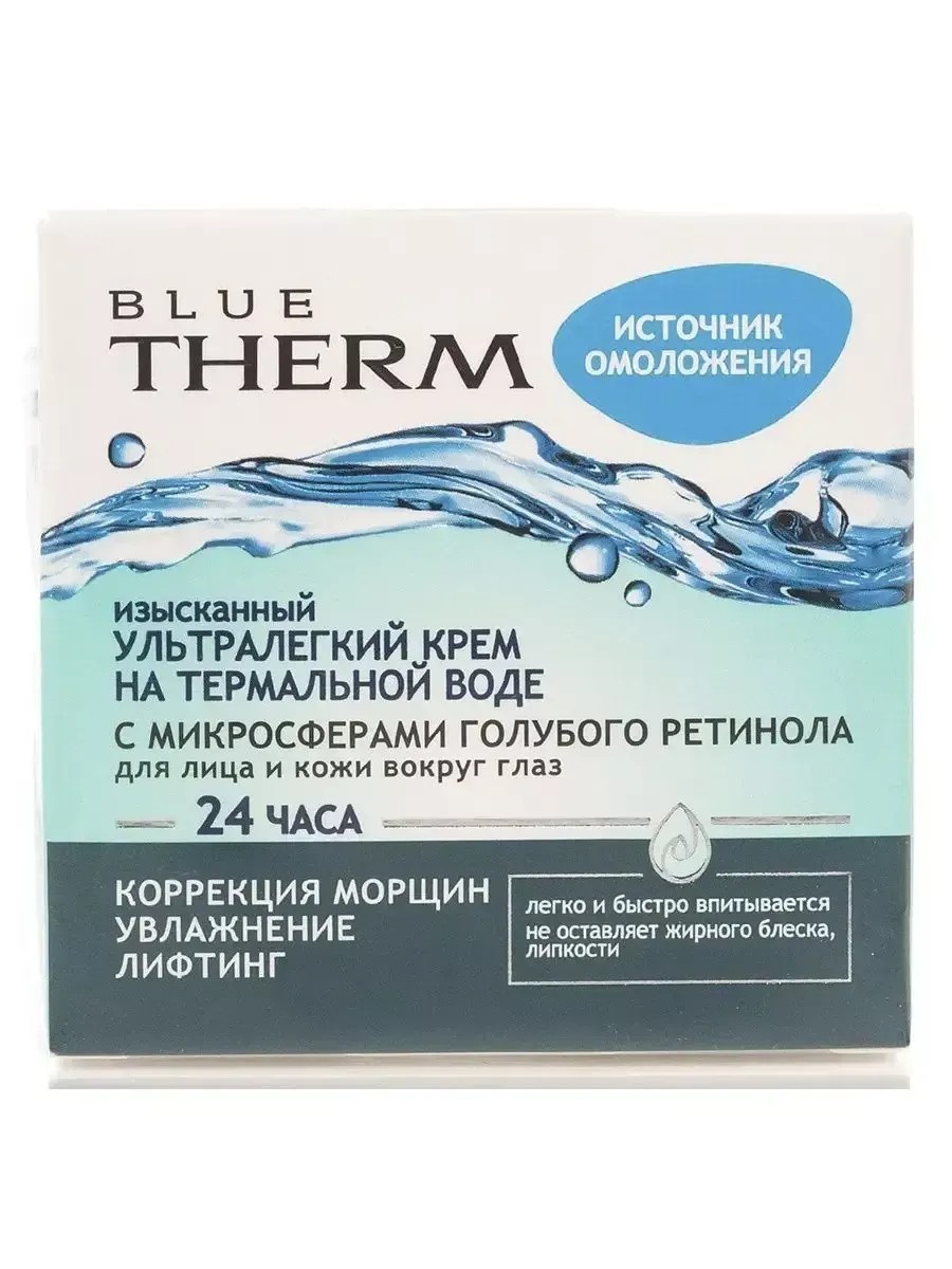 Вiтэкс, Крем для лица и кожи вокруг глаз BLUE Therm, 45 мл. Ультралегкий крем для лица и кожи вокруг глаз с 24-часовым действием на термальной воде с микросферами голубого ретинола для интенсивного увлажнения и разглаживания кожи с эффектом мгновенного лифтинга. Восстанавливает накопленные возрастом, поврежденные и состарившиеся участки кожи. Нежный изысканный крем мгновенно тает на коже: легко и быстро впитывается, не оставляя жирного блеска и ощущения липкости. Дарит полноценный омолаживающий уход за кожей в течение 24 часов.Подходит для всех типов кожи.