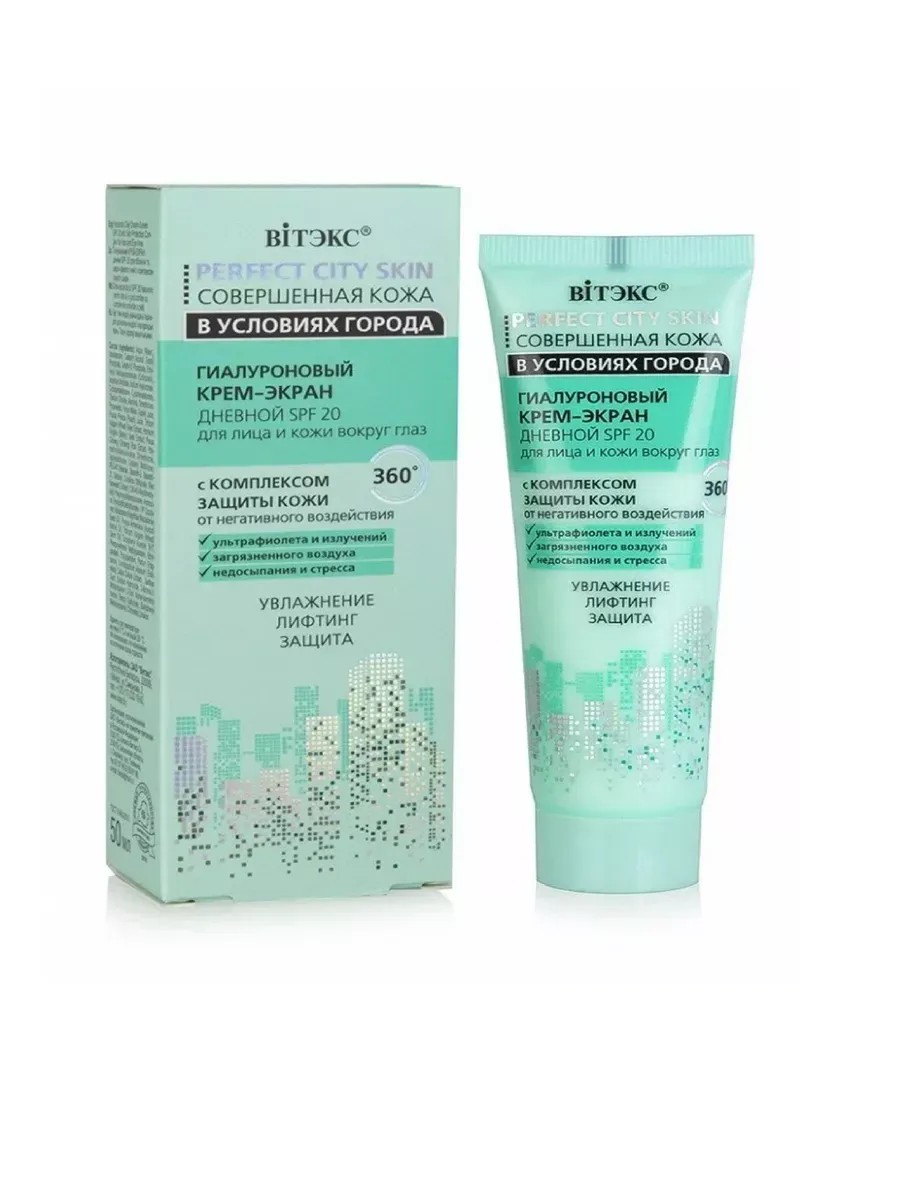 Витэкс, Крем-Экран Совершенная кожа в условиях города Гиалуроновый день SPF20 для лица и кожи вокруг глаз 50 мл, 1 шт. Высокотехнологичная формула крема разработана для сохранения молодости кожи в сложных условиях современной жизни города. Инновационные комплексы Phycocorail и Pronalen Bio в сочетании с гиалуроновой кислотой наполняют клетки мощными антиоксидантами, обеспечивают усиленную защиту от негативного воздействия ультрафиолета и излучений (в том числе от экранов девайсов – телефонов, планшетов, мониторов и т.д.), загрязненного воздуха, недосыпания и стресса. В течение всего дня кожа получает эффективный омолаживающий уход: поддерживается естественный уровень увлажненности, повышается тонус и упругость, цвет лица остается нежным, свежим и сияющим, как после прогулки на свежем воздухе.