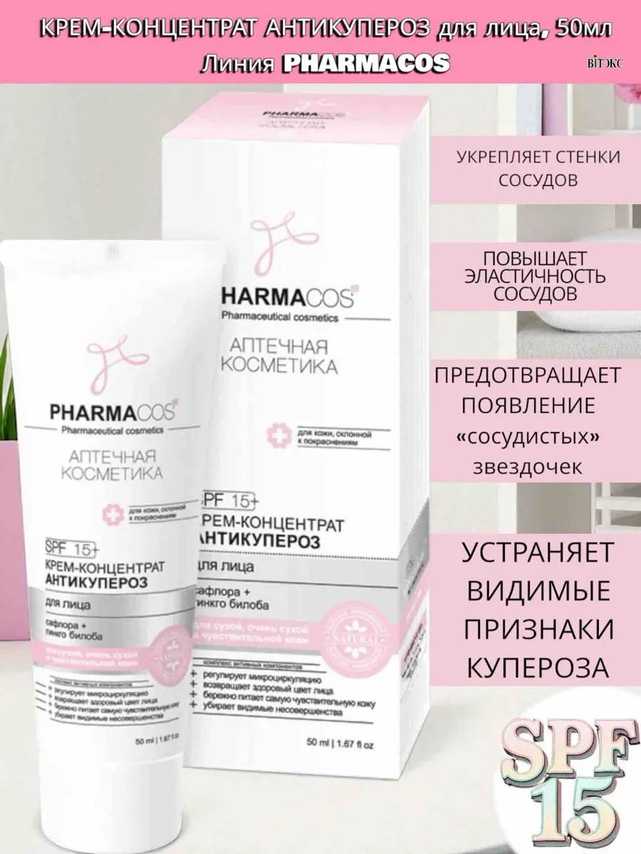 Крем для лица анти купероз от Витэкс — это эффективное средство для борьбы с покраснениями и сосудистыми звездочками. Формула крема, разработанная с учетом потребностей чувствительной кожи, мягко успокаивает и укрепляет стенки сосудов, уменьшая видимость купероза. Регулярное применение крема поможет вам вернуть коже здоровый и ровный тон. Благодаря легкой текстуре крем быстро впитывается, не оставляя жирного блеска, и подходит для ежедневного использования. Pharmacos Крем предназначен для ухода за кожей, склонной к покраснениям и куперозу. Активные компоненты крема укрепляют стенки сосудов и повышают их эластичность. Оказывая успокаивающее, смягчающее действие, предотвращают появление «сосудистых звездочек». Масло сафлоры (Carthamus tinctorius) устраняет мелкие морщинки, помогает снять воспаления, улучшая внешний вид кожи. Экстракт гинкго билоба (Ginkgo biloba) тонизирует, улучшает питание клеток, замедляя процесс старения. Высокоэффективный противокуперозный компонент регулирует микроциркуляцию, устраняет видимые признаки купероза.