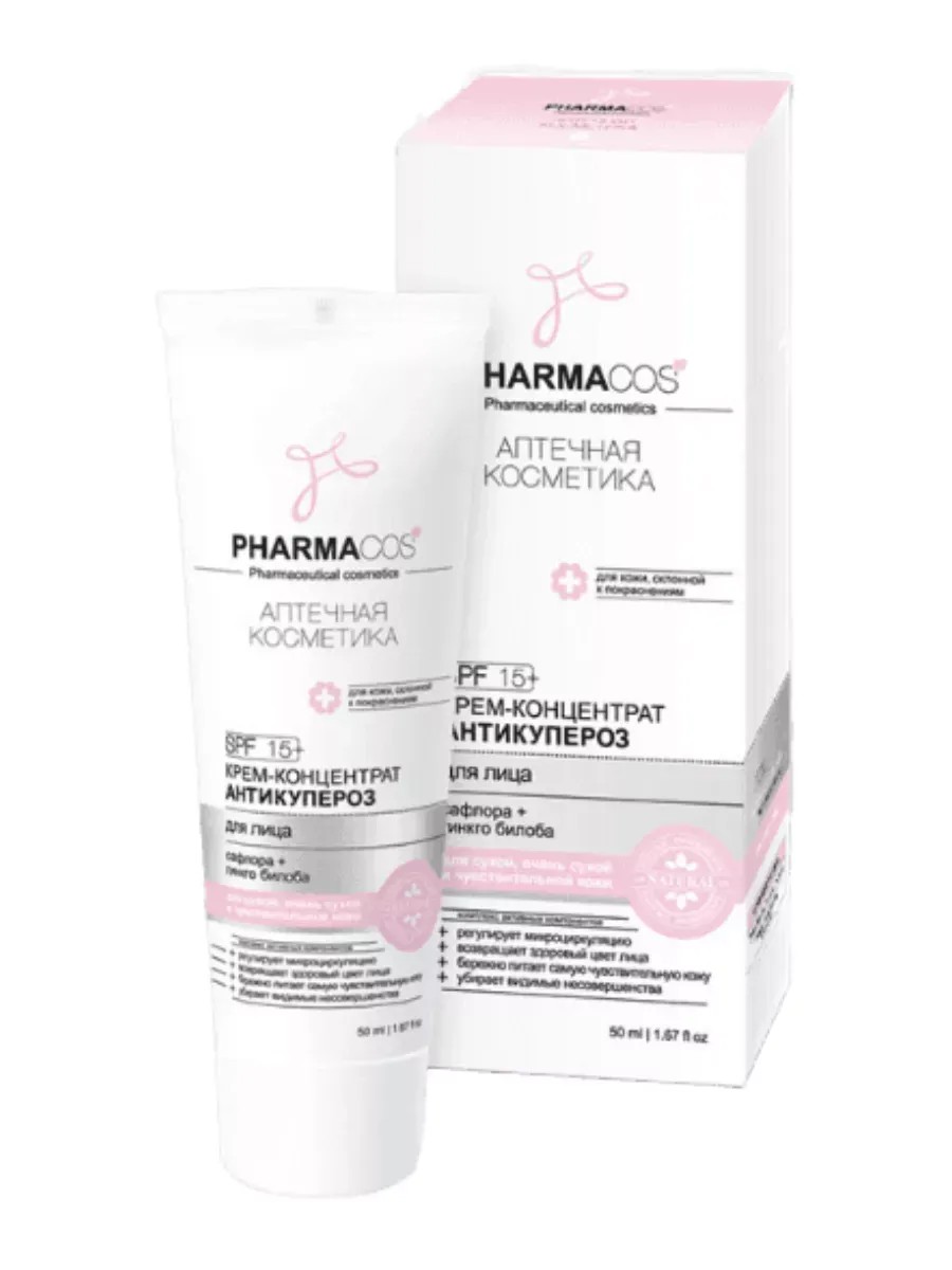 Pharmacos Anti-Cuperose Face Cream Concentrate SPF 15 from the Belarusian brand Vitex is an effective product specially formulated for skin with signs of rosacea and redness. This anti-rosacea face cream not only provides protection but also deep hydration, leaving skin healthier and more well-groomed. Facial care products with active ingredients strengthen blood vessel walls and improve their elasticity. They provide a soothing and softening effect, preventing the appearance of spider veins. Safflower oil eliminates fine wrinkles and helps relieve inflammation, improving the skin's appearance. Facial care with ginkgo biloba extract tones and improves cellular nutrition, slowing the aging process. The highly effective Biophytex component regulates microcirculation and eliminates visible signs of rosacea. This moisturizing face cream with SPF 15 neutralizes the harmful effects of UV rays, protecting weakened, redness-prone skin. Glycerin and sodium hyaluronate provide intense hydration, leaving skin soft and supple. Ethylhexyl methoxycinnamate and titanium dioxide protect the skin from harmful UV rays, preventing the appearance of new redness. Panthenol and calendula extract help soothe irritated skin, reducing inflammation and redness. Hydrolyzed yeast protein and safflower seed oil nourish and restore the skin, giving it a healthy appearance. This moisturizing and nourishing anti-rosacea face cream will become an indispensable part of your skincare routine. Regular use of this anti-rosacea and redness cream will help you achieve an even skin tone and improve its overall condition. This SPF face cream is recommended for dry, very dry, and sensitive skin. Give your skin the care it deserves with anti-couperose cream from Belarusian cosmetics Vitex!