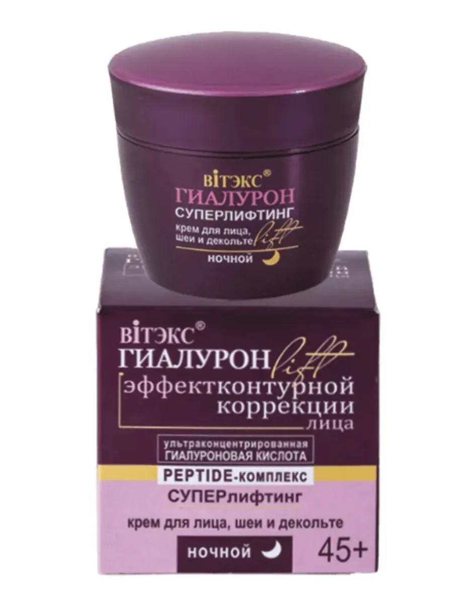 Суперлифтинг крем для лица, шеи и декольте ночной 45+ «Гиалурон LIFT» от белорусского бренда Витекс — это идеальное решение для женщин, стремящихся к эффективному антивозрастному уходу за кожей. Уходовая косметика для лица создана специально для возрастной категории 45+, обеспечивая коже необходимое увлажнение и восстановление. Крем для лица увлажняющий обладает ярко выраженным лифтинг-эффектом, разглаживает морщины и предотвращает появление новых, моделирует овал лица, возвращая коже упругость. В результате восстанавливается межклеточный объем, возвращается четкость контурам лица и разглаживаются морщины. Крем увлажняющий для лица содержит гиалуроновую кислоту, которая активно увлажняет и поддерживает оптимальный уровень влаги в клетках кожи, придавая ей упругость и свежесть. Масло ши в составе крема глубоко питает и смягчает кожу, а экстракты растений, такие как экстракт эдельвейса и гидролизованный экстракт красных водорослей, способствуют омоложению и улучшению текстуры кожи. Увлажняющий крем для лица от морщин эффективно борется с признаками старения благодаря уникальному комплексу пептидов, который стимулирует выработку коллагена и эластина. Это обеспечивает лифтинг-эффект и уменьшает видимость морщин. Увлажняющие компоненты, такие как глицерин и сквалан, делают кожу мягкой и бархатистой. Белорусская косметика линии «Гиалурон LIFT» помогает добиться эффекта контурной коррекции лица в домашних условиях. Ночной крем для лица 45+ от Vitex подходит для всех типов кожи и идеально вписывается в вечерний уход за лицом. Крем для лица антивозрастной не только восстанавливает кожу после дневных нагрузок, но и активно работает над её омоложением во время сна. Подарите своей коже качественный уход с антивозрастным кремом, который поможет сохранить молодость и красоту на долгие годы.