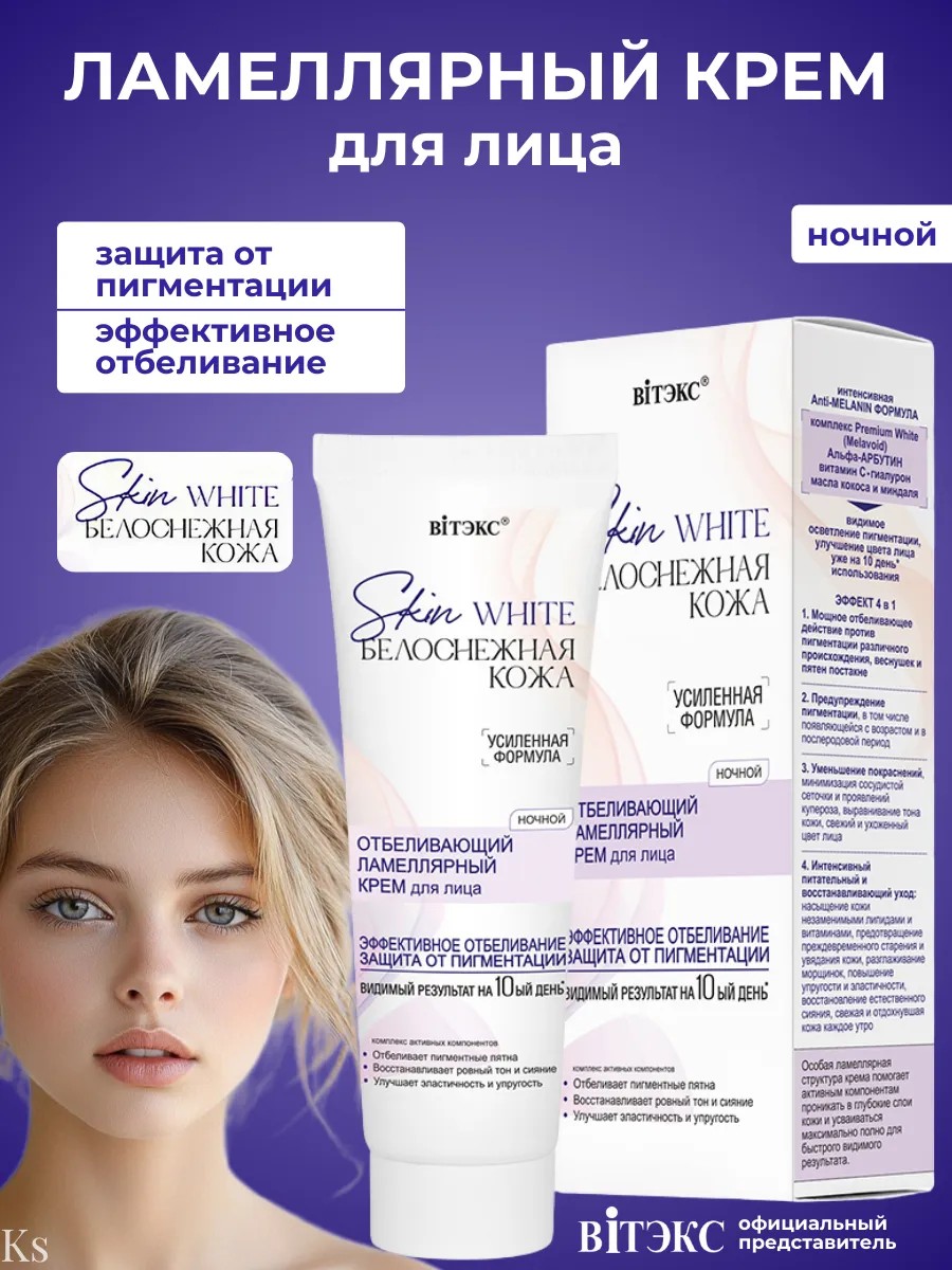 Отбеливающий ламеллярный крем для лица ночной Skin White Белоснежная кожа от белорусского бренда косметики Витэкс. Высокоактивный комплекс Premium White (Melаvoid) оказывает мощное отбеливающее действие против пигментации всех видов, в том числе возрастной, а также веснушек и пятен постакне, обеспечивая видимый эффект уже на 10 день* применения.