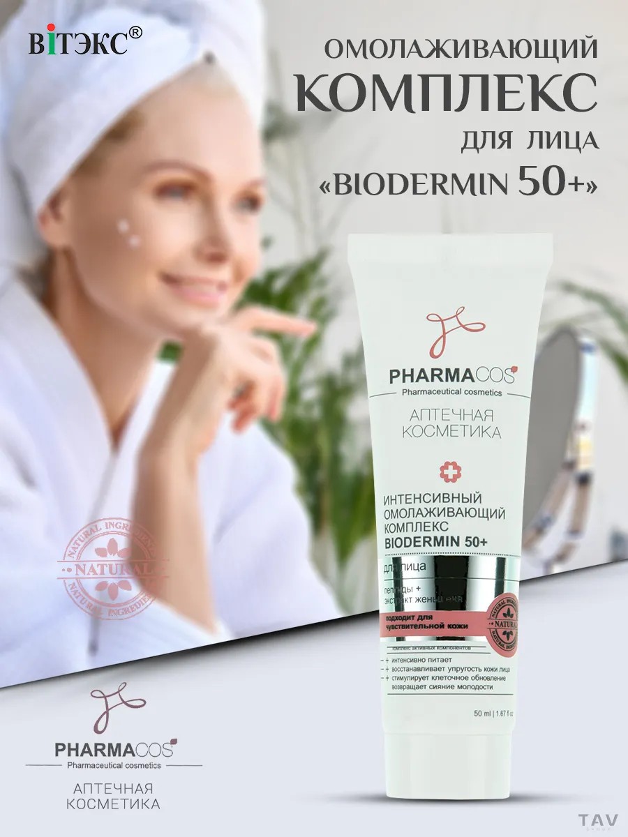 Intensive rejuvenating BIODERMIN 50+ facial complex. This biocomplex has an intense rejuvenating effect. Its special formula nourishes the skin, restoring its elasticity. With regular use, the skin becomes firmer and its youthful radiance returns. Peptides stimulate collagen production, which helps restore elasticity and firmness to the skin. They instantly smooth and tighten the skin, reducing the number and depth of wrinkles and restoring tone. Ginseng extract tones, softens, and nourishes the skin, providing it with energy for recovery. Shea butter saturates cells with valuable nutrients, leaving the skin smooth and silky. Directions: Apply the cream to clean skin, gently massage until completely absorbed.