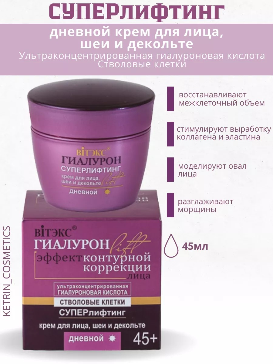 Крем для лица дневной, увлажняющий, восстанавливающий, подтягивающий, укрепляющий кожу . Эффект контурной коррекции для Вашей кожи! Возраст 45+ Уникальная линия ГИАЛУРОН LIFT помогает добиться эффекта контурной коррекции лица в домашних условиях. Специальные активные компоненты, усиливая действие друг друга, позволяют воздействовать сразу на 5 лицевых зон: подтягивают провисшую кожу шеи, сокращают двойной подбородок, уменьшают носогубные складки, сокращают морщины на лбу, вокруг глаз, моделируют овал лица.