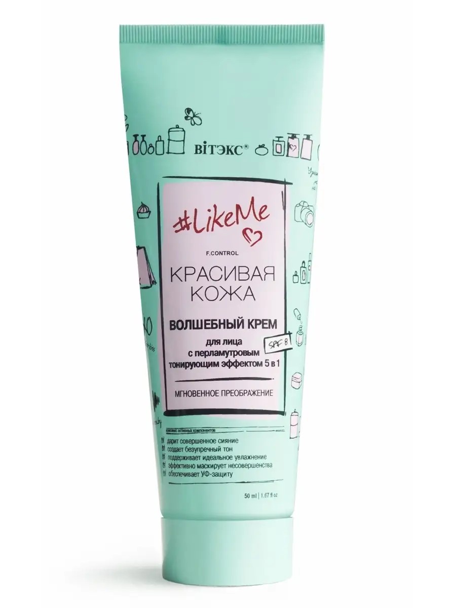Волшебный крем для лица с перламутровым тонирующим эффектом 5в1, SPF 8+ «LikeMe» от белорусского бренда Витекс — это идеальный дневной крем для лица, который сочетает в себе множество полезных свойств. Уходовая косметика для лица создана для всех типов кожи: нормальной, жирной и комбинированной, даря совершенное сияние и создавая безупречный тон. Увлажняющий крем для лица с спф обеспечивает идеальное увлажнение, благодаря чему ваша кожа выглядит свежей и ухоженной. Уход залицом эффективно маскирует несовершенства, придавая вашему лицу ровный и здоровый цвет. Кроме того, тонирующий крем для лица увлажняющий с SPF защищает вашу кожу от вредного воздействия ультрафиолетовых лучей, что особенно важно в условиях городской жизни и на солнце. Преображающий волшебный крем мгновенно подстраивается под цвет лица, выравнивает тон кожи и создает безупречное невесомое покрытие, маскируя все несовершенства молодой кожи, обеспечивает сияющий вид и идеальную гладкость. Солнечный коктейль из золотистого кумквата – настоящий природный энергетик – насыщает кожу витаминами и минералами, совершенствуя ее и наполняя жизненной силой. Дневной крем для лица станет незаменимым помощником в вашем уходе за кожей, обеспечивая комплексный подход к ежедневному уходу. Белорусская косметика линии LikeMe превратят уход за собой в настоящий праздник и позаботятся о сохранении совершенства, сияния и свежести твоей кожи! Крем подходит для использования в любое время года и станет вашим верным спутником в создании идеального образа. Наслаждайтесь ухоженной и сияющей кожей с кремом «LikeMe» от Vitex!