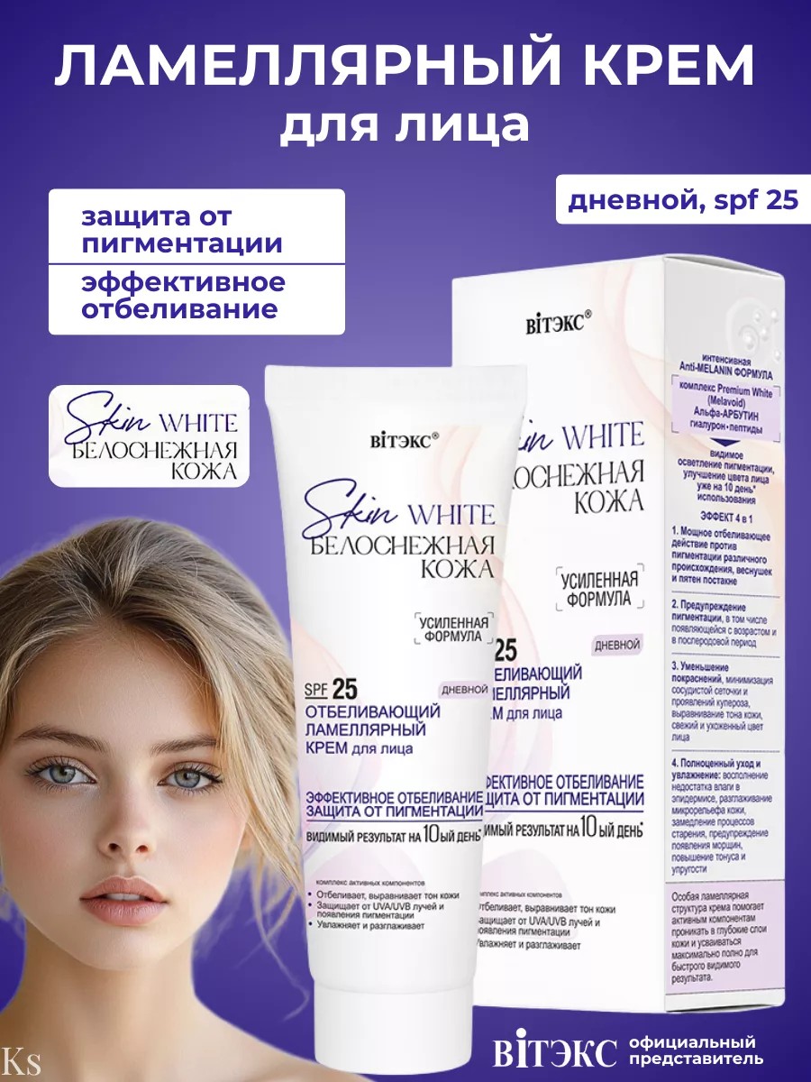 Ламеллярный крем для лица дневной отбеливающий SPF25 Skin White Белоснежная кожа от белорусского бренда косметики Витэкс. Высокоактивный комплекс Premium White (Melаvoid) оказывает мощное отбеливающее действие против пигментации всех видов, в том числе возрастной, а также веснушек и пятен постакне, обеспечивая видимый эффект.