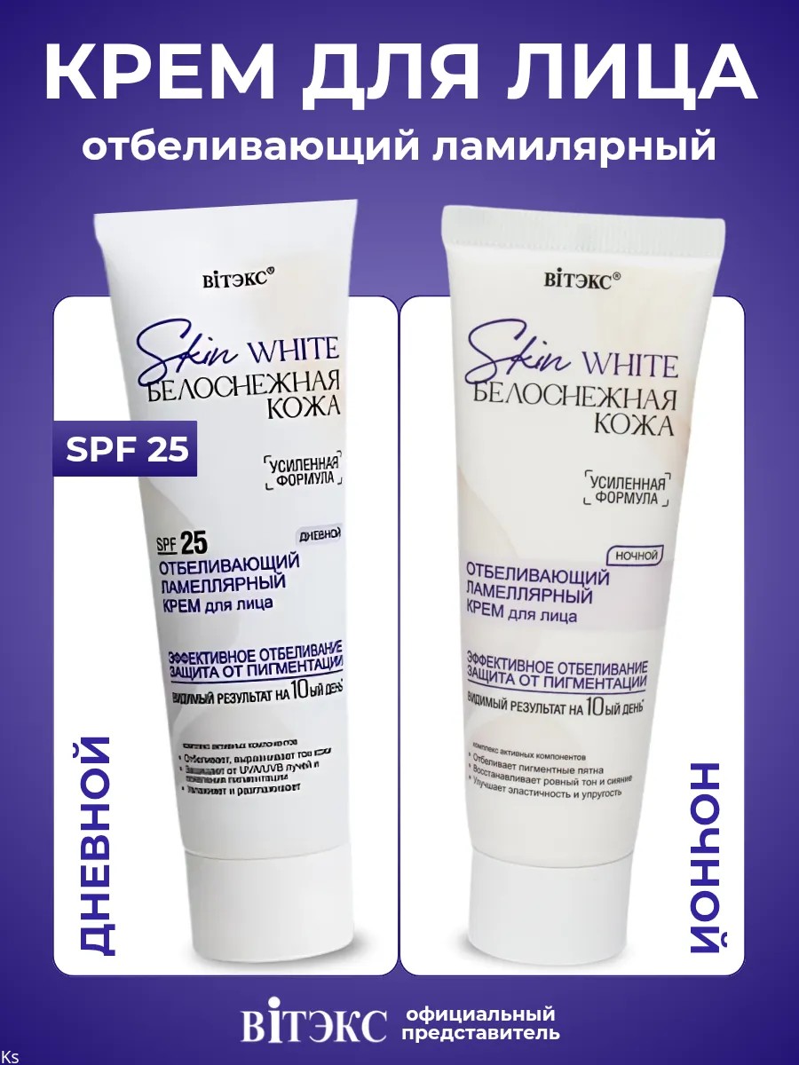 Ламеллярный крем для лица дневной отбеливающий SPF25 и ночной крем Skin White Белоснежная кожа от белорусского бренда косметики Витэкс. Высокоактивный комплекс Premium White (Melаvoid) оказывает мощное отбеливающее действие против пигментации всех видов, в том числе возрастной, а также веснушек и пятен постакне, обеспечивая видимый эффект.