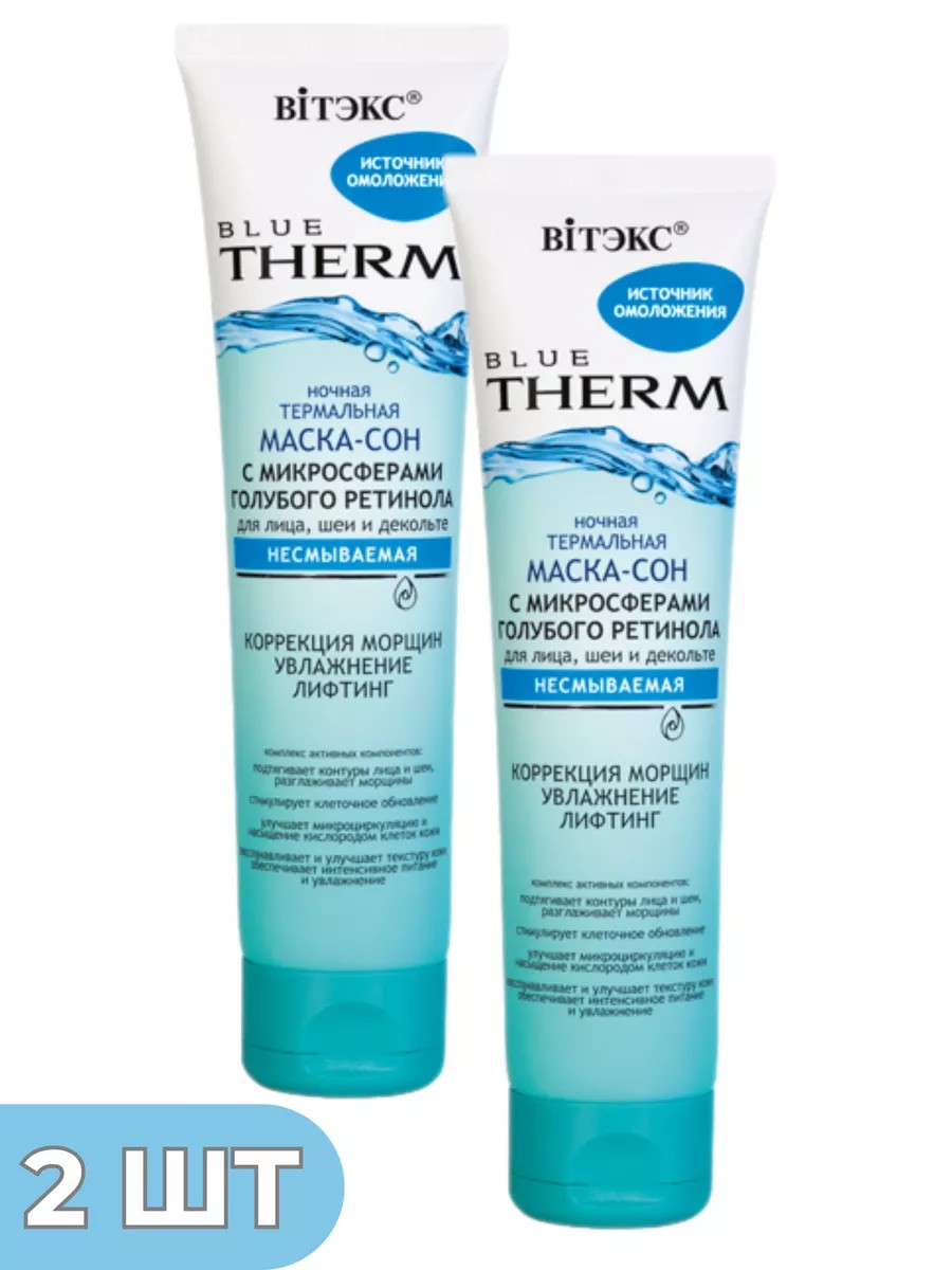 Ночная термальная маска-сон с микросферами голубого ретинола для лица, шеи и декольте 2 шт. "Blue Therm" от белорусского бренда Витекс — это идеальное решение для глубокого увлажнения и восстановления кожи во время сна. Маска для лица увлажняющая антивозрастная обладает уникальной формулой, которая обеспечивает интенсивный уход за кожей, помогая справиться с признаками старения. Ночная маска для лица несмываемая с микросферами голубого ретинола способствуют коррекции морщин, улучшая текстуру и упругость кожи. Сон – идеальное время для восстановления кожи. Набор уходовая косметика для лица с активными компонентами непрерывно действуют в течение всей ночи, обеспечивая интенсивное питание и увлажнение, восстанавливая объем и упругость кожи, заполняя и разглаживая морщины, подтягивая контуры лица. Уход за лицом содержит термальную воду и гиалуронат натрия, которые активно увлажняют и питают кожу, придавая ей свежесть и сияние. Набор масок для лица с экстрактом лотоса и пивных дрожжей успокаивают и восстанавливают кожу, придавая ей здоровый вид. Уход за кожей с маслом абрикосовых косточек и маслом пшеницы обогащают кожу витаминами и жирными кислотами, способствуя ее питанию. Легкая текстура маски позволяет ей впитываться, не оставляя жирного блеска, что делает ее идеальной для использования перед сном. Маска для лица от морщин подходит для всех типов кожи и обеспечивает лифтинг-эффект, улучшая контуры лица. Ночная маска для лица от белорусской косметики Vitex— это ваш надежный помощник в борьбе с морщинами и сухостью кожи. Маска для лица набор идеально подходит для ухода за кожей в домашних условиях и станет незаменимым элементом вашего набора уходовой косметики для лица. Позвольте себе роскошь глубокого увлажнения и восстановления с маской "Blue Therm"!