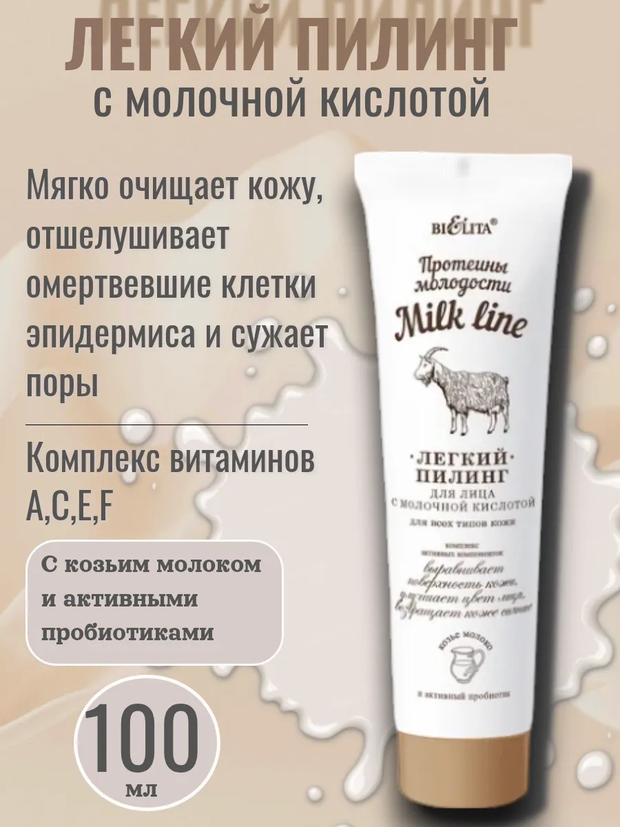 Белита Milk Line Пилинг для лица 100мл С молочной кислотой. Легкий пилинг благодаря активной формуле, содержащей молочную кислоту, мягко очищает кожу, отшелушивает омертвевшие клетки эпидермиса и сужает поры. При регулярном использовании дарит коже невероятную свежесть, безупречную чистоту и сияние. Протеины козьего молока в комплексе с активным пробиотиком омолаживают, питают и смягчают кожу, делая ее нежной и шелковистой.