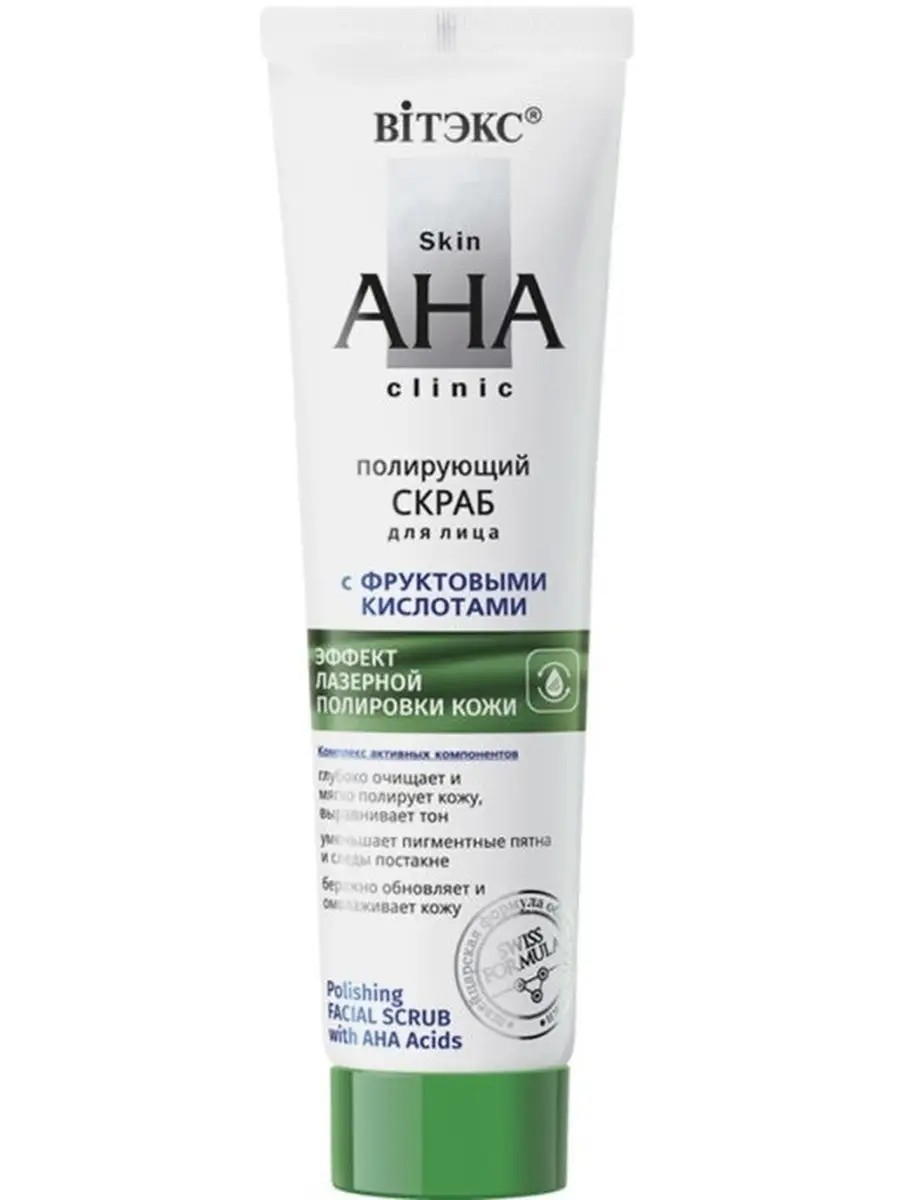 Скраб для лица полирующий с фруктовыми кислотами Skin AHA Clinic Витэкс. ЭФФЕКТ ЛАЗЕРНОЙ ПОЛИРОВКИ КОЖИ. Показания к применению: Тусклый, неровный цвет лица, Кожа с признаками увядания, Проблемная кожа (постакне, жирная себорея). Черные точки, пигментация.ОБНОВЛЕНИЕ - РАЗГЛАЖИВАНИЕ - УПРУГОСТЬ. Инкапсулированные АНА-кислоты и мягкие полирующие частицы, искусно соединенные в инновационной швейцарской формуле, позволяют одновременно провести механическое и химическое очищение кожи и добиться эффекта лазерной шлифовки лица. Благодаря глубокому двухуровневому очищению, исчезают черные точки и сглаживаются следы от акне, активизируются процессы обновления, кожа выравнивается, повышается ее плотность и упругость, цвет лица становится свежим и ярким. Усиливает действие средств последующего ухода. Может использоваться для подготовки кожи к кислотным пилингам. Применение: