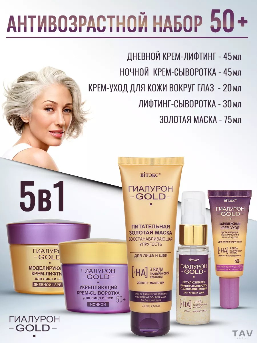 Набор для лица 5 в 1 создан с учетом особенностей и потребностей кожи в возрасте после 50 лет. Комплексный крем-уход против морщин, припухлостей и темных кругов для кожи вокруг глаз - современная интеллектуальная формула, в составе которой 3 вида гиалуроновой кислоты, биозолото; микроводоросли; масло ши; сквалан и «умные» омолаживающие и осветляющие комплексы, прицельно воздействует на главные признаки старения кожи: «гусиные лапки»; темные круги; припухлости; опущение верхнего века; преображая нежную кожу вокруг глаз каждый день. Результат: при регулярном применении темные круги становятся заметно светлее; уменьшаются припухлости под глазами; разглаживаются морщинки; взгляд становится свежим и распахнутым. Моделирующий крем-лифтинг для лица и шеи SPF 15, дневной. Эффект разглаживания морщин и подтягивания овала лица возникает мгновенно и сохраняется в течение всего дня благодаря особым моделирующим компонентам, которые образуют на коже невидимую поддерживающую микросеточку-корсет для лица и шеи. Укрепляющий крем-сыворотка для лица и шеи, ночной - совмещает в себе интенсивное действие омолаживающей сыворотки и комфорт питательного крема. Обеспечивает интенсивное питание; восстановление и укрепление кожи во время ночного отдыха. Эффект накапливается и сохраняется надолго. Эксклюзивная лифтинг-сыворотка. Невесомая шелковистая текстура моментально создает на поверхности кожи микросетку, которая, как невидимый каркас, подтягивает и укрепляет контуры лица и шеи, минимизирует видимость морщинок и заломов, «стирает» все признаки возраста и усталости, делает цвет лица однородным, свежим и красивым. Питательная золотая маска восстанавливающая упругость для лица и шеи. Увлажняет кожу в верхних слоях, подтягивает, выравнивает ее тон, дарит свежий, яркий, сияющий цвет лица. Проникает в средние слои кожи, стимулирует выработку собственной гиалуроновой кислоты, повышает упругость, плотность и эластичность кожи.