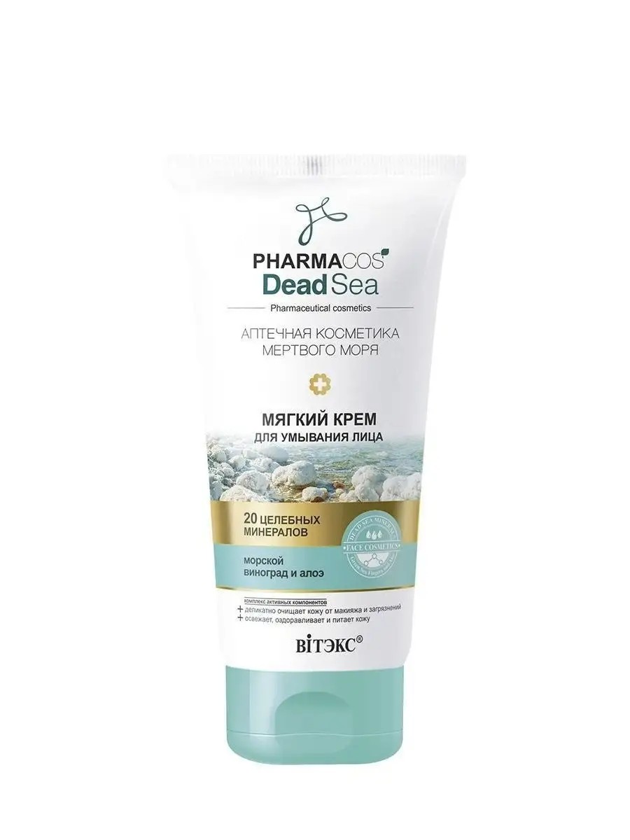 ВИТЭКС PHARMACOS DEAD SEA Крем ДЛЯ УМЫВАНИЯ лица мягкий 150мл,деликатно очищает кожу от макияжа и загрязнений; - освежает, оздоравливает и питает кожу. Мягкий крем для умывания позволяет быстро и очень нежно очистить кожу от загрязнений и удалить макияж без трения и пересушивания. Благодаря сбалансированному насыщенному составу, уже на этапе очищения крем начинает ухаживать за кожей. Основные активные компоненты: 20 целебных минералов Мертвого моря обогащают кожу ценными питательными веществами, необходимыми для правильной работы клеток, оказывают укрепляющее и оздоравливающее действие. Морской виноград восполняет дефицит витаминов и антиоксидантов, повышает защитные функции кожи, глубоко увлажняет и разглаживает морщинки. Алоэ великолепно питает и успокаивает раздраженную кожу, насыщает влагой кожу даже в глубоких слоях и препятствует обезвоживанию.