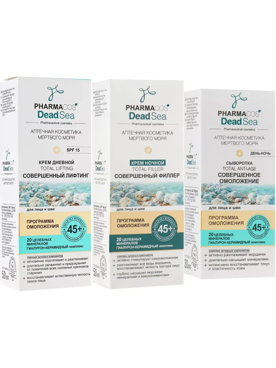 Набор кремов и сыворотка для лица и шеи 45+ «Total Lifting / Total Filler / Total Anti-Age» PHARMACOS DEAD SEA