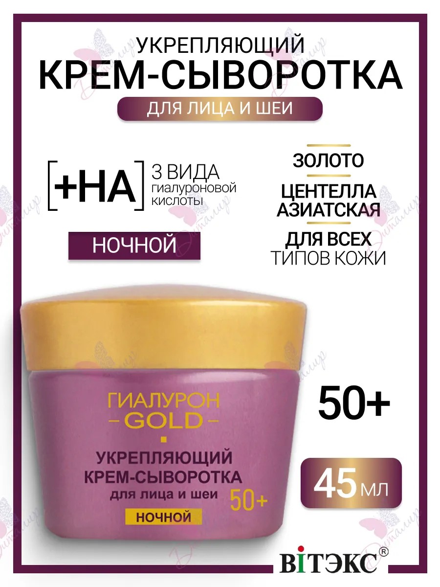 Hyaluron GOLD Firming Night Cream-Serum for Face and Neck 50+ Vitex. This firming night cream-serum, created with the specific needs of skin over 50 in mind, combines the intense action of a rejuvenating serum with the comfort of a nourishing cream. A modern composition of active ingredients, based on hyaluronic acid of three molecular sizes, biogold, centella asiatica, and ultra-nourishing shea butter and avocado oil, works at three levels of the epidermis (upper, middle, and deep), providing intensive nourishment, restoration, and strengthening of the skin during the night's rest. Hyaluronic acid of three molecular sizes penetrates all layers of the epidermis, activating deep cellular metabolism and restoring the skin's youthful potential. 1. High-molecular hyaluronic acid hydrates the skin in the upper layers, tightens, evens out its tone, and gives a fresh, bright, radiant complexion. 2. Medium-molecular hyaluronic acid penetrates the middle layers of the skin, stimulates the production of its own hyaluronic acid, and improves firmness, density, and elasticity. 3. Low-molecular hyaluronic acid acts in the deepest layers of the epidermis, filling the skin with moisture and "pushing out" wrinkles from within, strengthening and lifting facial contours, providing a powerful, prolonged rejuvenating effect. Proven effectiveness of hyaluronic acid. Increases the synthesis of the skin's own hyaluronic acid +93%. Improves skin smoothness +66%. Stimulates collagen synthesis +21%. Biogold acts as a conductor, allowing the active ingredients to penetrate the skin faster and deeper, significantly increasing their effectiveness and enhancing the rejuvenation process. Maximum results are achieved with the comprehensive use of the line's products. The effect is cumulative and long-lasting. Suitable for all skin types. Recommended for use from age 50. Directions: Apply in the evening to cleansed face and neck.