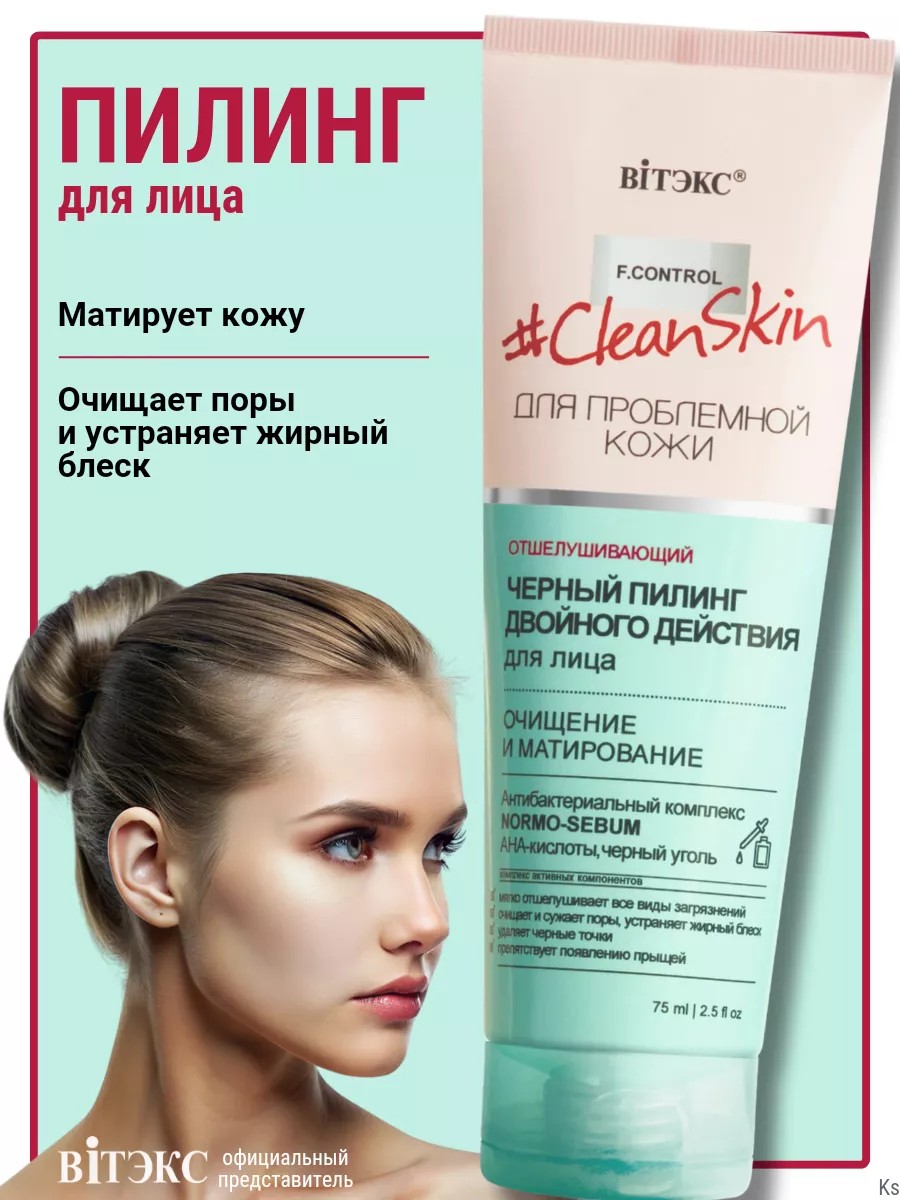 Пилинг ёрный для лица ОЧИЩЕНИЕ и МАТИРОВАНИЕ двойного действия CLEAN SKIN для проблемной кожи Витэкс. Мягко отшелушивает все виды загрязнений с кожи, очищает и сужает поры, устраняет жирный блеск. Удаляет черные точки, препятствует появлению прыщей. Черный пилинг адсорбирует излишки кожного жира, бережно отшелушивает ороговевшие клетки и мягко скатывает все виды загрязнений с кожи. Умная формула пилинга объединяет в себе механическую и химическую эксфолиацию. Деликатно, не травмируя кожу, глубоко очищает поры, удаляет черные точки, устраняет жирный блеск, выравнивает микрорельеф кожи, сглаживает следы постакне, улучшает цвет лица, предупреждает появление угревой сыпи и укрепляет защитные функции кожи.