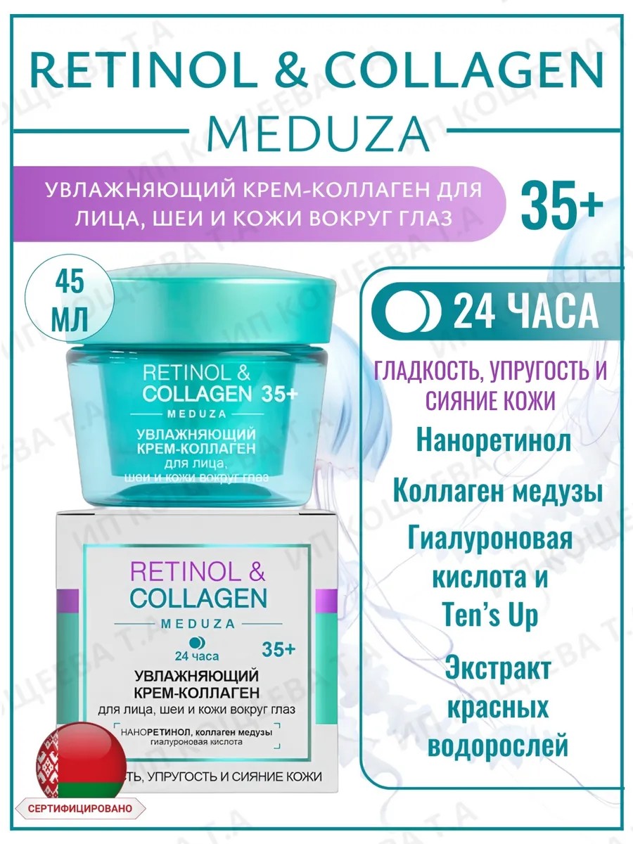Увлажняющий КРЕМ-КОЛЛАГЕН для лица, шеи и кожи вокруг глаз 35+ RETINOL&COLLAGEN meduza Витэкс. Линия RETINOL&COLLAGEN meduza - современное поколение омолаживающего ухода. Уникальная формула крема объединила в себе "звездные" омолаживающие и увлажняющие компоненты, которые запускают процессы обновления и омоложения кожи, предотвращая процессы старения. **Наноретинол** способствует деликатному обновлению кожи, обладает удивительной способностью разглаживать морщины и укреплять кожу, восстанавливая ее естественную красоту и молодость. **Коллаген медузы** поддерживает оптимальный уровень увлажнения, повышает упругость и эластичность кожи, предупреждает появление морщин. **Гиалуроновая кислота и Ten's Up** глубоко увлажняют кожу, обеспечивают выраженный эффект лифтинга и разглаживания морщин. Экстракт красных водорослей восстанавливает уставшую кожу, уменьшает поры, придает коже здоровое естественное сияние, мягкость и бархатистость. Применение: нанесите утром и/или вечером на очищенную кожу лица и вокруг глаз.