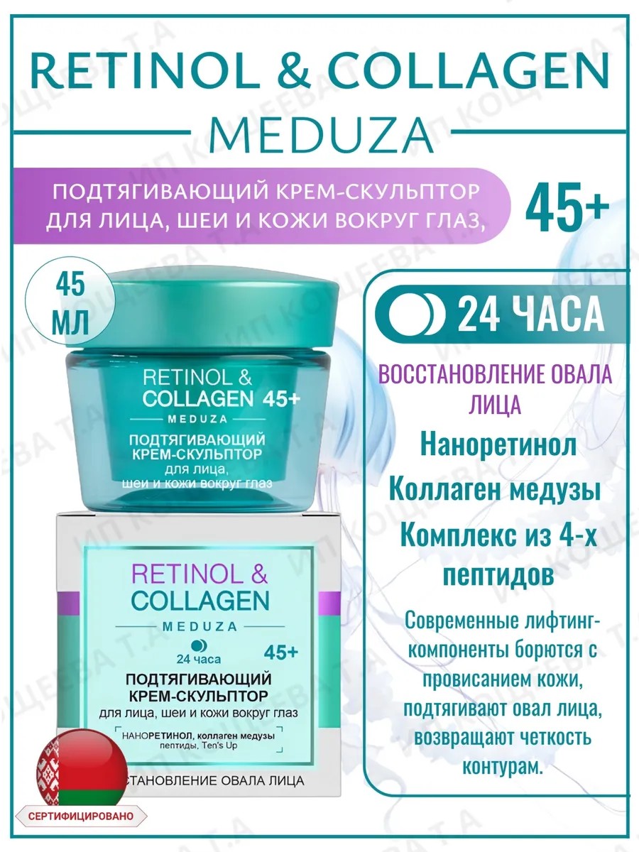 Подтягивающий КРЕМ-СКУЛЬПТОР для лица, шеи и кожи вокруг глаз 45+ RETINOL&COLLAGEN meduza Витэкс. Линия RETINOL&COLLAGEN meduza - современное поколение омолаживающего ухода. Роскошная формула крема объединила в себе "звездные" омолаживающие и подтягивающие компоненты, которые запускают процессы регенерации кожи и восстановления овала лица. Наноретинол стимулирует обновление клеток, повышает упругость кожи, сокращает морщины и улучшает цвет лица. Коллаген медузы восполняет недостаток собственного коллагена, укрепляет овал лица, делает кожу более упругой и плотной, разглаживает морщины. Комплекс из 4-х пептидов выравнивает поверхность кожи, уменьшая возрастные изменения. Обладает доказанным** действием: - на 38% увеличение упругости кожи; - на 74% улучшение гладкости; Современные лифтинг-компоненты борются с провисанием кожи, подтягивают овал лица, возвращают четкость контурам. Применение: нанесите утром и/или вечером на очищенную кожу лица и вокруг глаз.