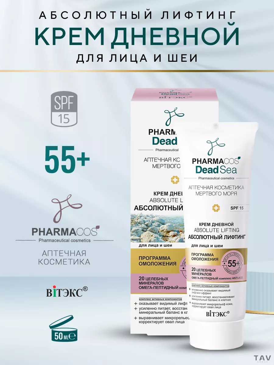 Absolute Lifting Day Cream 55+ for Face and Neck SPF 15. Provides a visible lifting effect. Provides intense nourishment and restores mineral balance in cells. Evens out skin texture and contours the face. This intensive formula, with a rich complex of ingredients specifically tailored to the physiological needs of mature skin, provides absolute lifting, minimizes signs of internal and external aging, and significantly improves skin quality and appearance. It actively nourishes cells with essential nutrients, stimulates self-healing processes, helps maintain healthy hydration levels, and combats aging. It has a noticeable rejuvenating effect on the skin: it tightens and smoothes, reduces the appearance of all types of wrinkles, lightens age spots, evens out complexion, and improves skin density, firmness, and elasticity. Instantly transforms skin: it forms a structural mesh on the skin's surface, which, like an invisible corset, beautifully defines and maintains a clear facial contour, smooths wrinkles, and adds expressiveness to facial features. The result: moisturized, toned, and smoothed skin looks younger, fresher, and gently radiant all day long. Directions: Apply the cream evenly in the morning to clean, dry skin of the face and neck with light patting movements. The cream can be used as a makeup base.