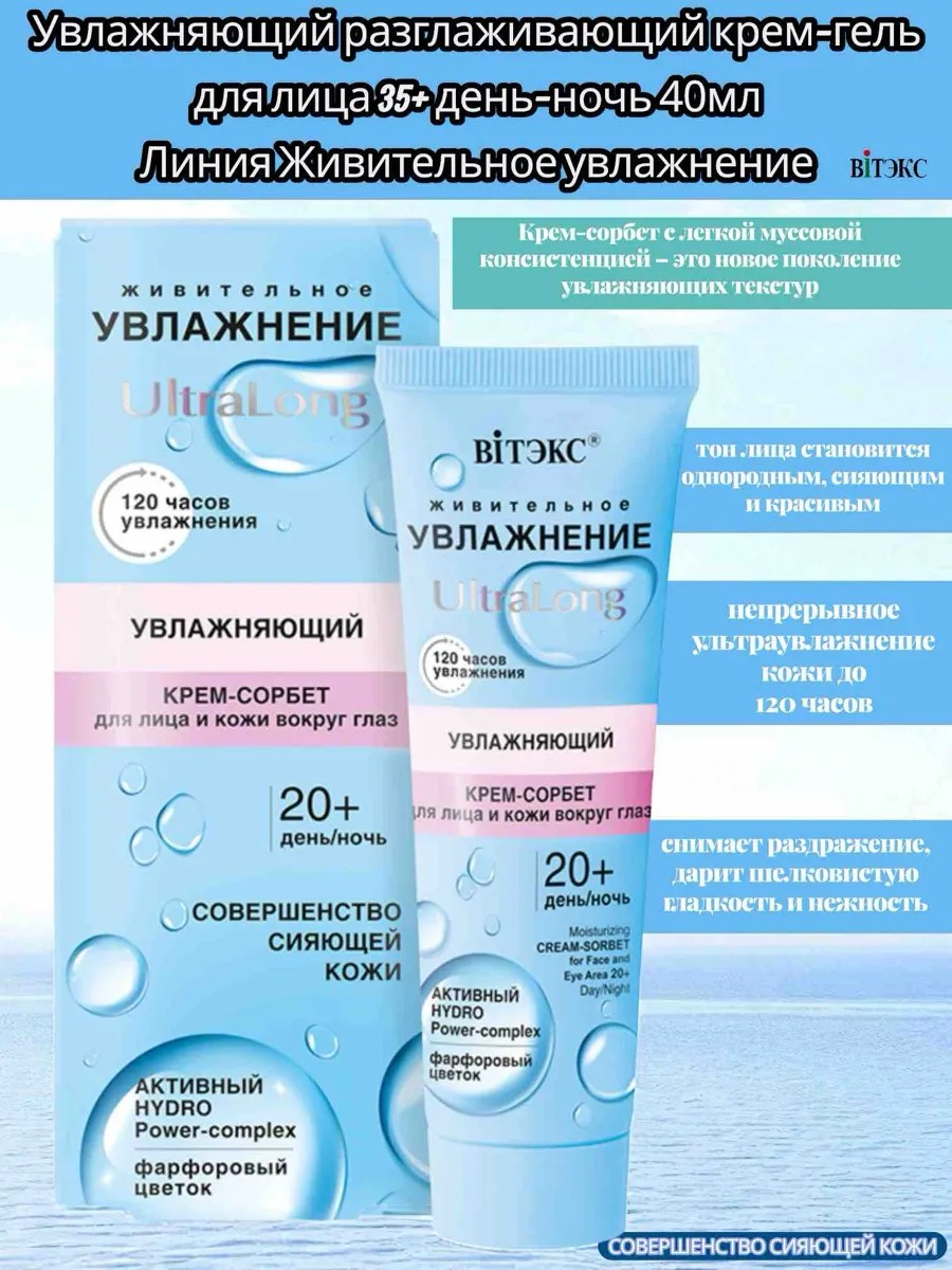 Увлажняющий крем-сорбет для лица и кожи вокруг глаз 20+ день-ночь 40 мл. Крем-сорбет с легкой муссовой консистенцией – это поколение увлажняющих текстур, созданных экспертами ВИТЭКС в сотрудничестве с французскими учеными. Благодаря большому проценту активных компонентов в составе достигается быстрый и заметный результат: кожа напитывается влагой буквально на глазах, тон лица становится однородным, сияющим и красивым.