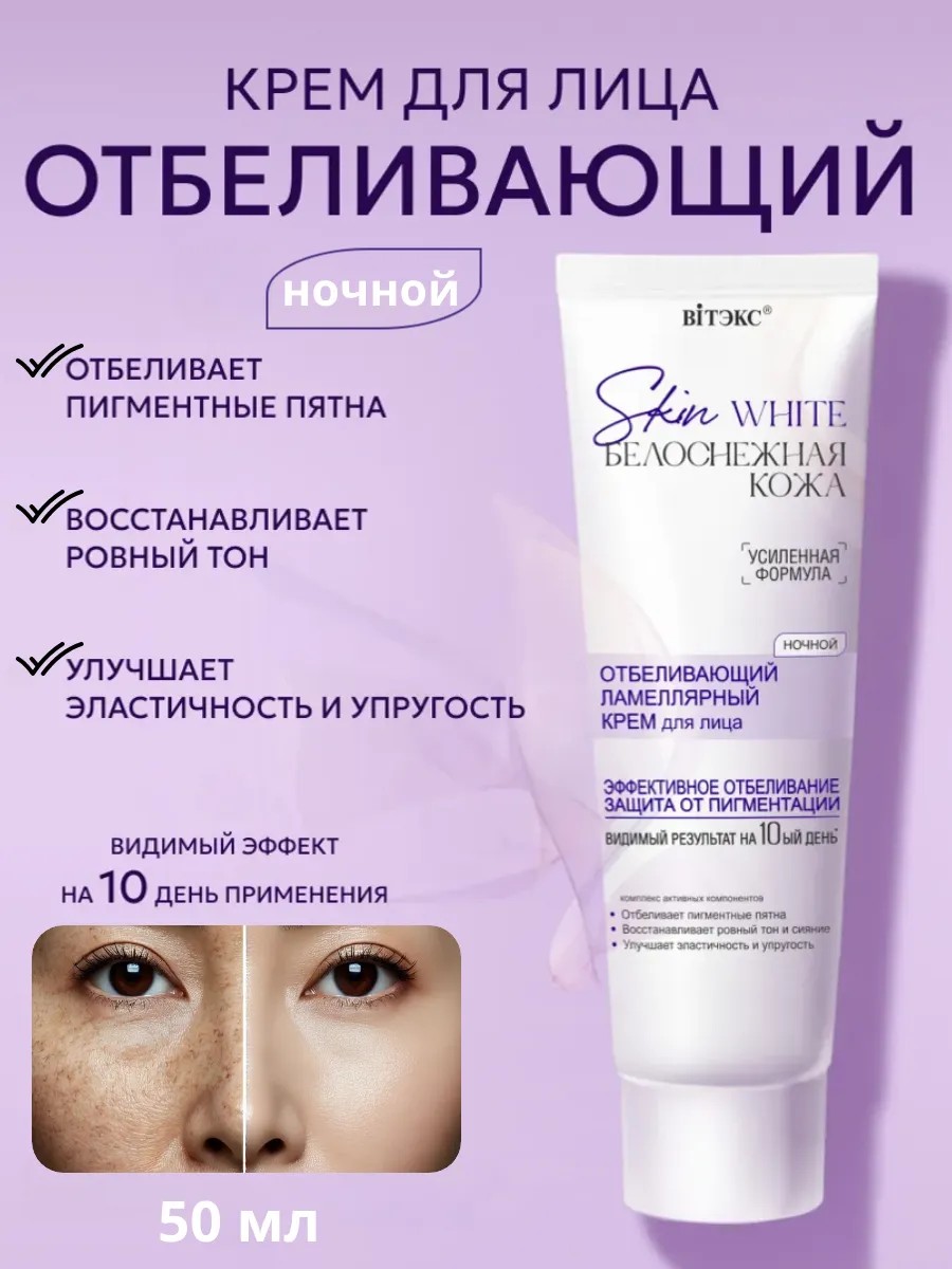 Skin White БЕЛОСНЕЖНАЯ КОЖА ОТБЕЛИВАЮЩИЙ ламеллярный КРЕМ для лица НОЧНОЙ. Мощное отбеливающее действие против пигментации различного происхождения, веснушек и пятен постакне
