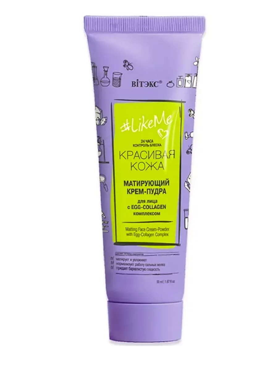 Vitex LikeMe Beautiful Skin, Mattifying Face Cream-Powder with EGG-Collagen Complex 24-Hour, 50 ml. The powdery-velvety texture of the cream spreads easily over the skin, forming a mattifying, moisturizing, and smoothing mesh that nourishes the skin for 24 hours. Immediately after application, pores become less visible, unwanted shine disappears, and the skin acquires a pleasant smoothness and velvety feel. With regular use, the skin's normal hydrolipid balance is restored, its elasticity increases, and the complexion becomes even and radiant. The EGG-COLLAGEN complex is a source of collagen, enzymes, B vitamins, and minerals that increase the elasticity of the skin and pore walls, causing enlarged pores to gradually tighten and shrink. Egg white helps combat sebaceous gland activity and visibly tightens pores, effectively removing sebum from deep within the pores, eliminating blackheads, and preventing their reappearance. Promotes moisture retention by creating a "water reserve" in the skin, softening and smoothing the skin and preventing the appearance of dry creases. Golden kumquat, a solar energizer, infuses the skin with vitamins, awakening its energy and radiance.