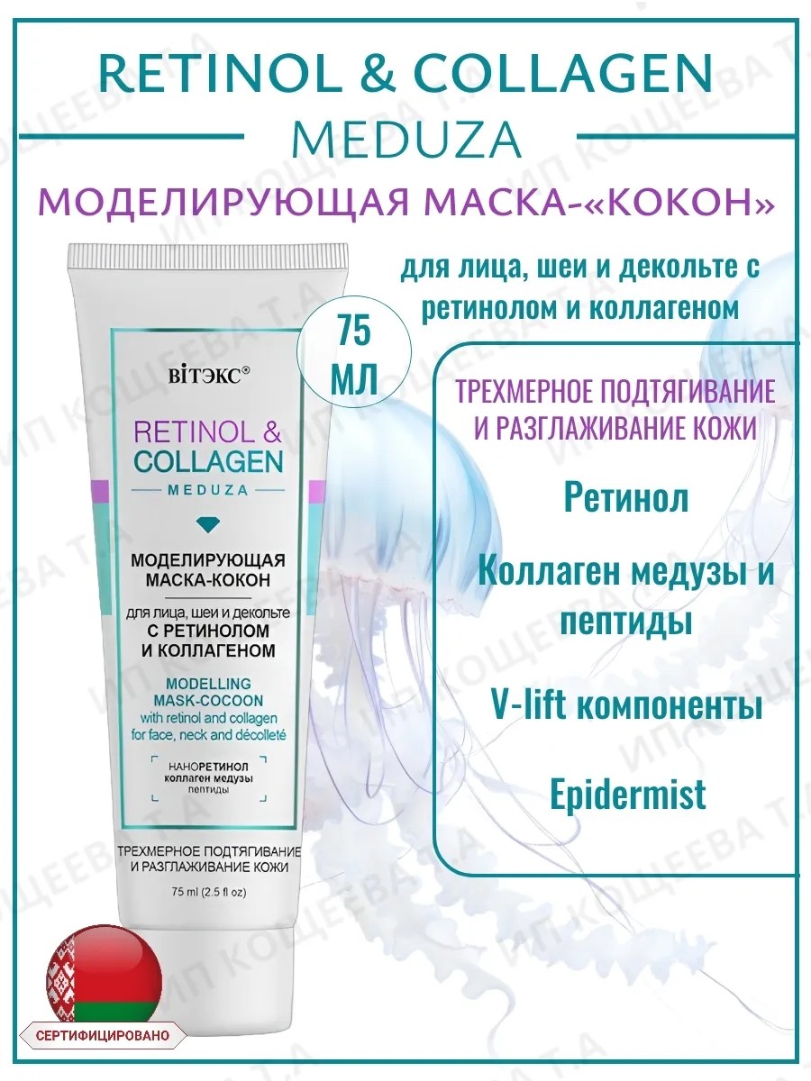 Modeling mask-"cocoon" for face, neck and décolleté with retinol and collagen RETINOL&COLLAGEN meduza Vitex. The RETINOL&COLLAGEN meduza line is a modern generation of rejuvenating care. This exceptional mask with a soft, silky texture, like a "cocoon," gently envelops the skin and provides three-dimensional smoothing and tightening. Nanoretinol helps renew and restore the skin, stimulates collagen synthesis, reduces wrinkles, and improves complexion. Jellyfish collagen and peptides create a three-dimensional mesh on the skin's surface for tightening and smoothing, slowing the aging process. V-lift components provide a pronounced lifting effect, enhancing the contours of the face and neck. Fucogel eliminates moisture deficiency in cells, increasing skin firmness and elasticity. Directions: Apply a thick layer to cleansed skin for 10-15 minutes, avoiding the eye area. Rinse with water. Ingredients: Water, Cyclopentasiloxane, Cyclohexasiloxane, Dimethicone Crosspolymer, Kaolin, Cetearyl Alcohol, Polysorbate-60, PEG-100 Stearate, Ceteareth-25, Sodium Hyaluronate, Macadamia Integrifolia (Macadamia) Seed Oil, Glycerin, Theobroma Cacao (Cocoa) Butter, Hydrolyzed Collagen, Sodium Polyacrylate, Hydrogenated Polydecene, Trideceth-6, Carbomer, Polysorbate-20, Palmitoyl Oligopeptide, Palmitoyl Tetrapeptide-7, Sorbitol, Lecithin, Retinyl Palmitate, Xanthan Gum, Biosaccharide Gum-1, Butylene Glycol, Pentylene Glycol, Sodium Chloride, Hydrolyzed Red Algae Extract, Phenoxyethanol, Methylparaben, Ethylparaben, Propylparaben, Isopropyl Myristate, Triticum Vulgare (Wheat) Germ Oil, Tocopheryl Acetate, BHT, Parfum (Fragrance), Angelica Archangelica (Angelica) Root Water, Citric Acid, 2-Bromo-2-Nitropropane-1,3-Diol, CI 42090.
