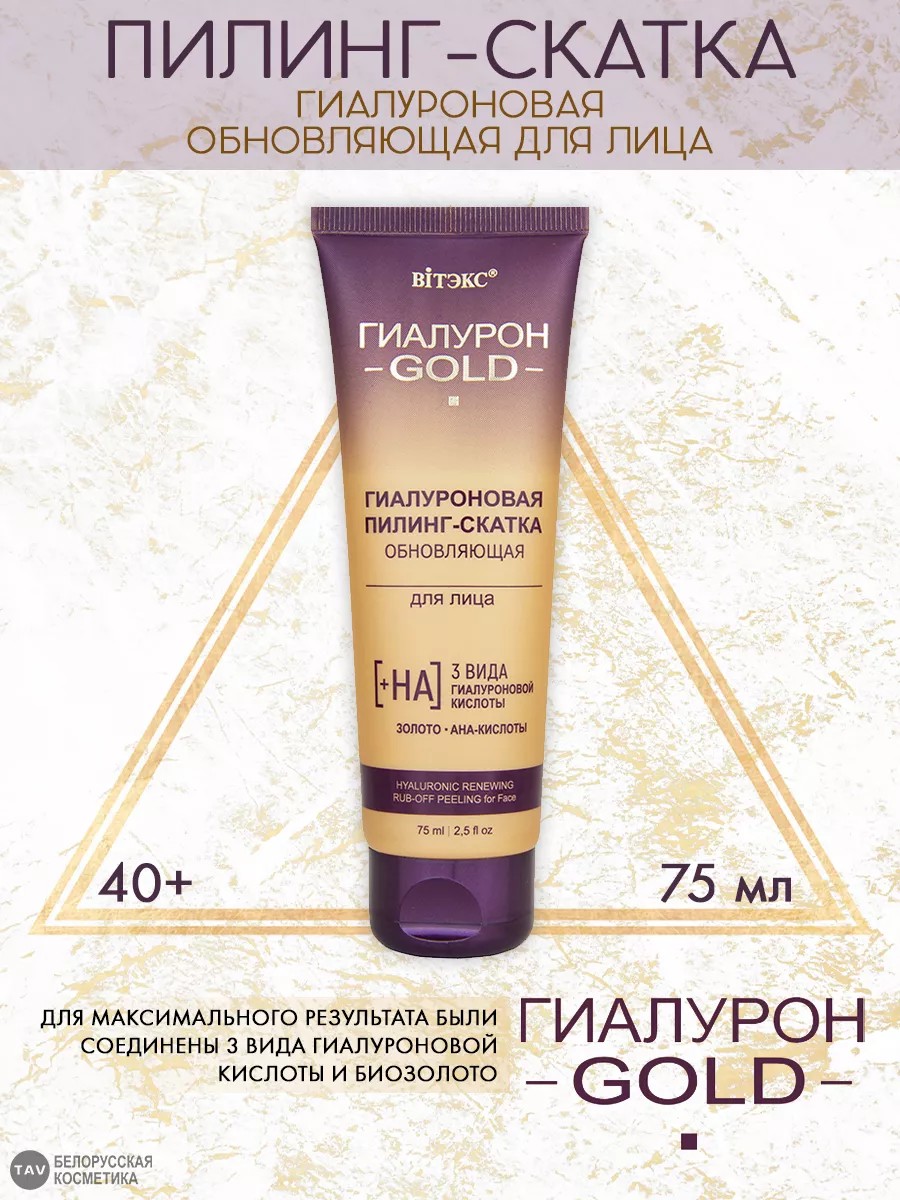 Очень нежная к коже и при этом эффективная пилинг-скатка мягко скатывается и превосходно очищает эпидермис от загрязнений, ороговевших клеток и токсинов, открывая чистую, обновленную кожу, которая сияет свежестью и молодостью. В основе формулы - гиалуроновая кислота трех молекулярных размеров: Высокомолекулярная гиалуроновая кислота увлажняет кожу в верхних слоях; выравнивает ее тон; дарит свежий, яркий, сияющий цвет лица. Среднемолекулярная гиалуроновая кислота проникает в средние слои кожи, стимулирует выработку собственной гиалуроновой кислоты, повышает упругость, плотность и эластичность кожи. Низкомолекулярная гиалуроновая кислота действует в самых глубоких слоях эпидермиса, восполняет запасы влаги и "выталкивает" морщинки изнутри, укрепляет и подтягивает кожу. А так же Биозолото и Тройной комплекс АНА-кислот. Применение: нанесите на влажную кожу, избегая области вокруг глаз, помассируйте до появления комочков, смойте водой. Рекомендуется использовать 2-3 раза в неделю.