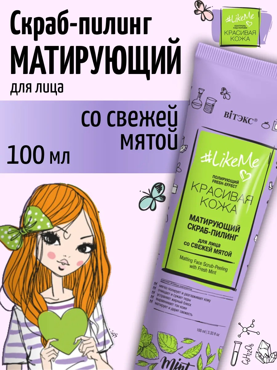 Матирующий СКРАБ -ПИЛИНГ для лица со свежей мятой #LikeMe контроль над порами Витэкс. Скраб -пилинг дарит коже глубокое очищение и ровный цвет лица за счет комбинации отшелушивающих и себорегулирующих техник: 1. Скрабирование и массаж натуральными микрогранулами для аккуратной полировки кожи и улучшения упругости. 2. Обновление гликолевой кислотой для выравнивания цвета лица и разглаживания кожи. 3. Матирование природными компонентами, чтобы устранить жирный блеск и сохранить свежесть кожи в течение всего дня. Свежая мята освежает и тонизирует кожу, способствует сужению пор, улучшает цвет лица. Гликолевая кислота эффективно и бережно отшелушивает ороговевшие клетки, увлажняет и разглаживает кожу, выравнивает микрорельеф. Натуральный скрабирующий комплекс из абрикосовых косточек обеспечивает глубокое очищение пор, а также мягкий массаж кожи, благодаря чему активизируются обменные процессы в эпидермисе. EGG-COLLAGEN комплекс наполняет кожу коллагеном и другими ценными веществами, интенсивно питает и увлажняет, снижает раздражения и воспаления.