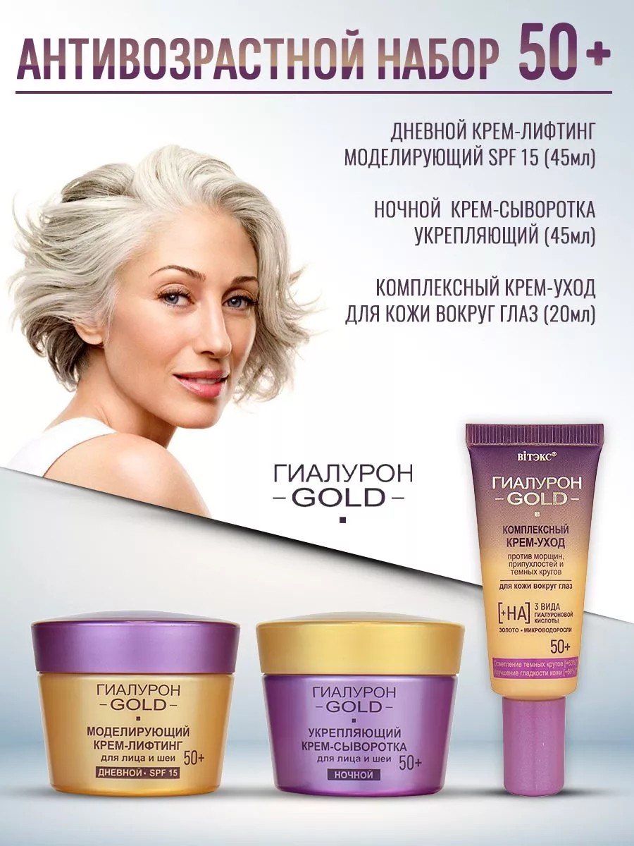 Набор для лица создан с учетом особенностей и потребностей кожи в возрасте после 50 лет. Комплексный крем-уход против морщин, припухлостей и темных кругов для кожи вокруг глаз - современная интеллектуальная формула, в составе которой 3 вида гиалуроновой кислоты. Эффект разглаживания морщин возникает мгновенно и сохраняется в течение всего дня благодаря особым лифтинг - компонентам, которые образуют на коже невидимую поддерживающую микросеточку-корсет. Результат: при регулярном применении темные круги становятся заметно светлее; уменьшаются припухлости под глазами; разглаживаются морщинки; взгляд становится свежим и распахнутым. Моделирующий крем-лифтинг для лица и шеи SPF 15, дневной - интеллектуальная богатая формула, основанная на 3 видах гиалуроновой кислоты, включает биозолото, муцин улитки, ультрапитательные масла авокадо и жожоба и работает на трех уровнях эпидермиса (верхнем, среднем и глубинном), оказывая выраженное омолаживающее действие. Результат: при регулярном применении уменьшаются все виды морщин (мимические; носогубные складки; глубокие морщины и заломы); восстанавливается чёткий овал лица и контуры шеи; кожа выглядит подтянутой, отдохнувшей и ухоженной весь день. Укрепляющий крем-сыворотка для лица и шеи, ночной - совмещает в себе интенсивное действие омолаживающей сыворотки и комфорт питательного крема. Современная композиция активных компонентов, в основе которой гиалуроновая кислота трех молекулярных размеров; биозолото; центелла азиатская; ультрапитательные масла ши и авокадо; работает на трех уровнях эпидермиса (верхнем; среднем и глубинном); обеспечивает интенсивное питание; восстановление и укрепление кожи во время ночного отдыха. Применение: нанесите вечером на очищенную кожу лица и шеи. Максимальный результат достигается при комплексном применении средств линии. Эффект накапливается и сохраняется надолго. Назначение: Увлажнение; УФ-защита; Лифтинг; Омоложение; Антивозрастной уход; Осветление; Снятие отечности; Питание, Восстановление.