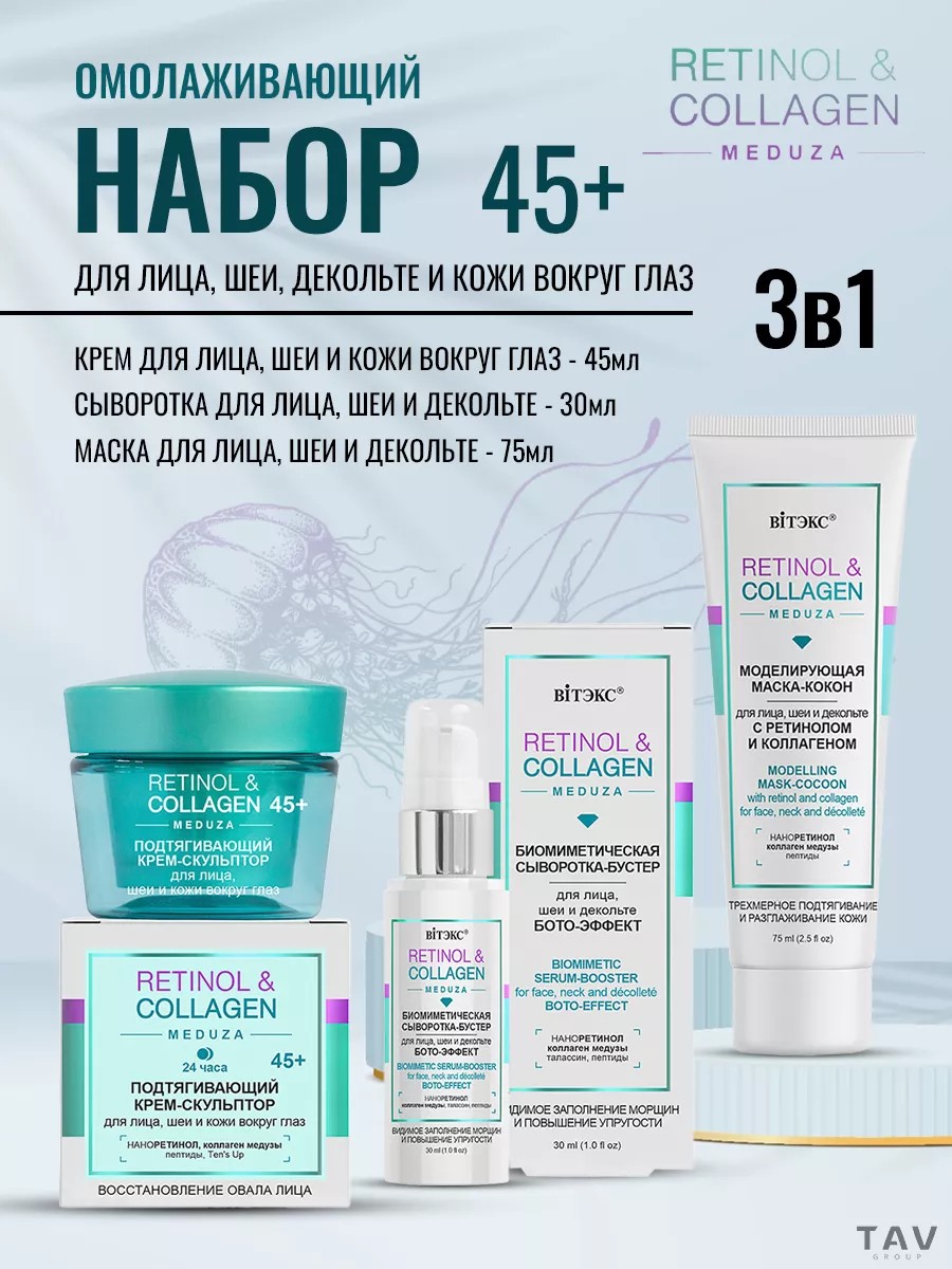 Антивозрастной набор для лица, шеи и кожи вокруг глаз 3 в 1. Подтягивающий крем-скульптор для лица, шеи и кожи вокруг глаз, 45+. Восстановление овала лица. Роскошная формула крема объединила в себе «звездные» омолаживающие и подтягивающие компоненты, которые запускают процессы регенерации кожи и восстановления овала лица. Наноретинол стимулирует обновление клеток, повышает упругость кожи, сокращает морщины и улучшает цвет лица. Коллаген медузы восполняет недостаток собственного коллагена, укрепляет овал лица, делает кожу более упругой и плотной, разглаживает морщины. Комплекс из 4-х пептидов выравнивает поверхность кожи, уменьшая возрастные изменения. Обладает доказанным действием. Современные лифтинг-компоненты борются с провисанием кожи, подтягивают овал лица, возвращают четкость контурам. Биомиметическая сыворотка-бустер для лица, шеи и декольте. Бото-эффект видимое заполнение морщин и повышение упругости. Формула сыворотки основана на «звездных» омолаживающих компонентах, которые способствуют активному омоложению и подтягиванию кожи, разглаживанию и «замораживанию» морщин. Талассин оказывает выраженный бото-эффект: способствует миорелаксации и сокращает морщины. Наноретинол укрепляет клеточный каркас, повышает упругость и плотность кожи, разглаживает морщины, выравнивает цвет лица. Коллаген медузы восполняет недостаток собственного коллагена, укрепляет структуру кожи, уменьшает количество и глубину морщин. Моделирующая маска-«кокон» для лица, шеи и декольте с ретинолом и коллагеном. трехмерное подтягивание и разглаживание кожи. Исключительная маска с нежной шелковистой текстурой подобно «кокону» нежно обволакивает кожу и обеспечивают трехмерное разглаживание и подтягивание кожи. Наноретинол помогает обновить и восстановить кожу, стимулирует синтез коллагена, уменьшает морщины, улучшает цвет лица. Коллаген медузы и пептиды создают на поверхности кожи трехмерную сеточку для подтягивания и разглаживания, замедляют процесс старения.